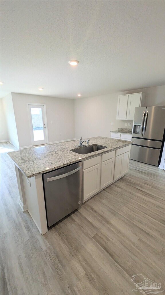 This well-maintained 4 bedroom,3 bath home offers a clean,modern layout with comfortable living spaces throughout. The exterior features a classic brick façade,a two-car attached garage,and a spacious driveway. The fully fenced backyard provides ample room for outdoor activities and includes a covered patio,ideal for relaxing or entertaining. Inside,the home features an open-concept floor plan with durable wood-style flooring and neutral finishes. The kitchen is equipped with white cabinetry,granite countertops,a large center island with sink,and stainless steel appliances,creating a functional and inviting space that opens directly to the main living area. Recessed lighting and natural light enhance the bright,airy feel of the home. The Master Bedroom is spacious with an adjoining bath that has a double vanity,large shower,and a walk-in closet. Convenient access to Interstate I-10,with the pristine white beaches of Navarre are just minutes away. This property requires participation in the MSPM Resident Benefit Package for an additional monthly fee. Additional information on this program can be found upon submission of application.