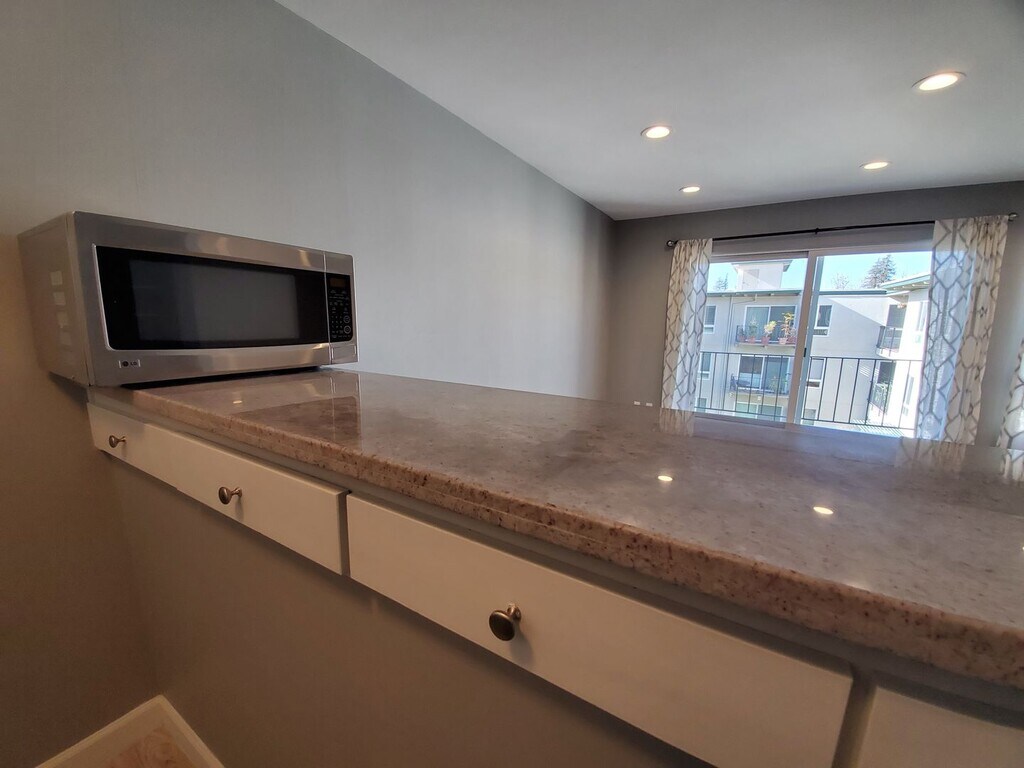 Enjoy this peaceful setting with a sunny balcony facing views of the courtyard and the rolling hills of the Peninsula. Top floor and approximately 500 square feet, updated kitchen has granite countertops and stainless steel appliances. Unit has flush ceilings, recess lighting, and custom bathroom. Water, garbage, one assigned/covered parking space and one external storage are all included with rent. Woodlake is the perfect location - walking distance to Burlingame Avenue, Burlingame Cal Train and Coyote point regional park/bay trail. Easy commute up and down the Peninsula on 101 or 92. Amazing amenities at the complex include pools, large gym, Jacuzzi, saunas in locker room, lots of green space and tennis courts. No pets, no smoking. HOA charges $150 as a one time registration fee.