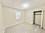 View In 3D: This 3-bedroom, 1-bath duplex offers 915 square feet of comfortable living space with luxury vinyl plank flooring throughout. The home features a large, open living area flowing into a spacious kitchen, which provides ample cabinet and counter space. The kitchen is also equipped with a dual-basin sink, refrigerator, range, and dishwasher. The full bathroom includes a single-basin vanity and a tub/shower combo. Additional highlights include a utility room with space for a full-size washer and dryer, as well as a large covered porch overlooking the open backyard.