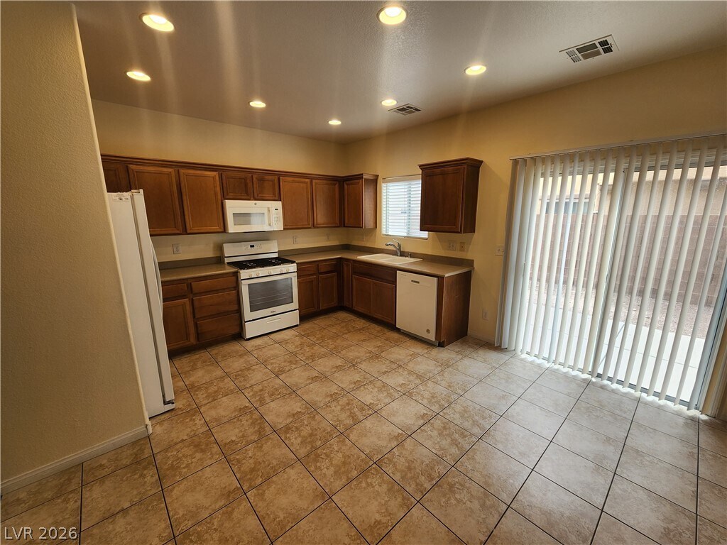 Move in ready CORNER lot house in Mountain's Edge! 4 beds, 2.5 baths, and spacious laundry room upstairs. Primary bedroom w/ 3 closets! All 4 beds upstairs, all appliances, full size 2-car garage. Downstairs, separate formal living and dining room combo, separate family room, and open layout kitchen with dining space for comfort. RENT INCLUDES trash, sewer, and yard maintenance - don't miss this great deal!
