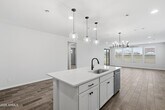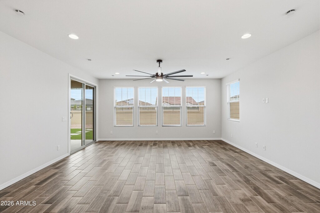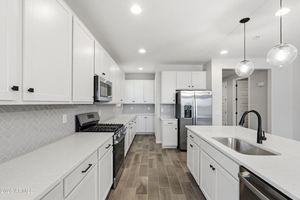 No Application Fees! Beautiful 4 bedroom,2.5 bathroom San Tan Valley home located in the newer North Creek community. This spacious open floor plan features wood plank style tile flooring throughout all living and high traffic areas,two-tone neutral paint,upgraded doors and fixtures,and 2-inch faux wood window blinds throughout,with neutral carpeting in each bedroom. The large open living room flows seamlessly into the formal dining area and additional workspace,offering flexible living options. The upgraded kitchen is a standout,featuring granite countertops,dark tile backsplash,extended cabinet and countertop space,a large island with breakfast bar,separate walk-in pantry,gas range,and stainless steel appliances. The split floor plan includes a spacious primary suite with an oversized walk-in closet,separate linen storage,and a large step-in shower. Washing machine and dryer are included. The professionally landscaped backyard offers easy-to-maintain desert landscaping,synthetic grass,and no rear neighbors for added privacy. North Creek offers outstanding community amenities including a large resort-style pool,children's playground,pickleball courts,basketball courts,and expansive green spaces. Conveniently located near Hunt Highway,this home provides easy access to shopping,dining,schools,and outdoor recreation throughout San Tan Valley and Queen Creek. Enjoy a newer community feel with modern amenities and wide open desert surroundings. All Denali Real Estate residents are automatically enrolled in the Resident Benefits Package (RBP) for $55.00/month which includes Renter's Liability Insurance,Credit Building to help boost the resident's credit scores with timely rent payments,up to $1M Identity Theft Protection,HVAC air filter delivery (for applicable properties),our best-in-class resident rewards program,and much more!