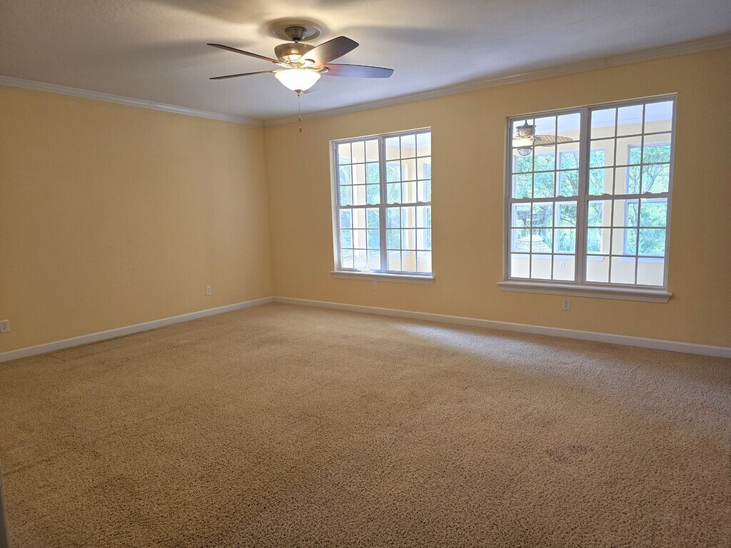 Available for immediate occupancy! Beyond spacious 4 bedroom, 2.5 bath home in Windmill Plantation, with side entry three-car garage. Large covered, rocking-chair front porch opens to two-story foyer with coat closet and built in shelving, formal dining room to the right and den to the left. The formal dining room has chandelier, wainscotting and large picture window. Adjacent butlers pantry has cupboard space and granite counters, plus undercabinet lighting. Great room has ceiling fan, built in shelving and double sided gas log fireplace. Kitchen with granite counters, stainless appliances, tile backsplash, gas range with double oven, kitchen island with raised breakfast bar, built-in desk with undercabinet lighting, and breakfast nook with decorative lighting, chair rail and other side of fireplace. Hall off kitchen has SECOND butlers pantry with floor to ceiling cupboard and granite counter, laundry room with cupboards and washer/dryer hookup and door to three-car garage that has storage bin. Large sunroom off breakfast nook with tile floors and bank of windows overlooking backyard. Primary suite upstairs with trey ceiling and ceiling fan, walk in closet with shelving system, en suite bath with dual sink vanity, walk in shower, separate jetted tub and water closet. Spacious 2nd, 3rd and 4th bedrooms with ceiling fans. Hall bathroom with tub/shower combo. Terraced backyard has a shaded pergola with flagstone patio, adjacent koi pond, and shady fenced backyard!