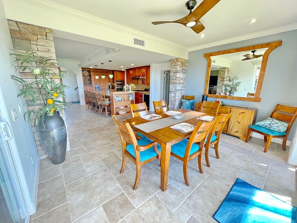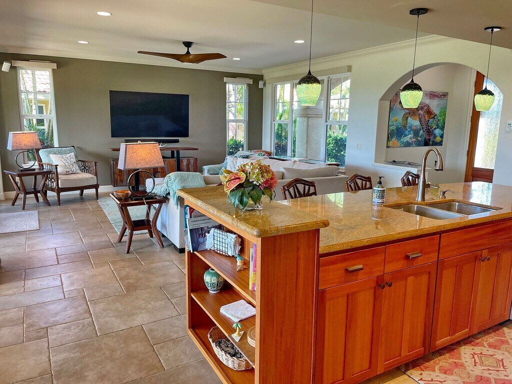 This move-in-ready 2 story, 4 bedroom, 3 full bath home in gated Hokulani Golf Villas is Maui living at its finest. Hokulani Golf Villas is Kihei’s revered condominium property. Each unit is freestanding with No Attached Neighbors. This home has both upper and lower spacious lanais overlooking the ocean and 18th hole, back dropped by Haleakala. Also features a garage with space to park one car, private driveway and beautifully manicured private yard. Hokulani Golf Villas is conveniently located just minutes away from the ocean and all the activities, shops and restaurants that Kihei has to offer. Walking distance to Maui Brewing and Gilligan's for casual dining Maui style. There are beautiful green spaces and walking paths that lead to a large Infinity Pool, Hot Tub and Community Pavilion near the entrance to Hokulani. Hokulani has residents of all ages and is an active community with lots of opportunities for social gatherings. (Lunches, Golf, Clubs, Social Hours and even Concerts) This home has been meticulously care for and finely furnished. Upon entering through the eight foot mahogany front door, you will appreciate the open air feel and light-filled great room’s soaring ceilings. Allowing more space are eight-foot tall glass sliders creating the seamless indoor/outdoor Maui lifestyle. This home has tropical surrounding landscaping creating privacy from neighbors on each side of the house. Exceptional finishes and top of the line components including a central A/C system, central vacuum system, granite kitchen counters, gourmet kitchen, expansive island with bar seating, mahogany cabinet upgrades in both the kitchen and bathrooms, large dual compressor Kitchen Aide refrigerator, gas stove top supplied by a 124 gallon LP gas tank, under-counter wine cooler, full size laundry room. Added in 2022: new carpet, new remote control powered shades with UV block out in living/dining and master suite, new living room sectional and upgraded entertainment center, and a surround sound theater system. The master suite has a walk-in closet, a rain glass shower enclosure, a deep, jetted soak tub and 2 lanais. There are two additional bedrooms and another full bath upstairs. Main level has additional bathroom and guest room/den in addition to large living room, dining and gourmet kitchen. Plenty of room for entertaining and guests! The backyard opens up to the 18th hole of the Maui Nui Golf course offering expansive fairway and beautiful ocean views from both upper and lower lanais. You will live on the Lanai! Comfortably appointed with sun loungers, bar-height table, large teak table for entertaining and new grill. The home is very energy efficient with a 30 Panel Solar PV system with two Tesla batteries. Electric bills should thus be minimal with normal usage. Included in the rent is standard trash removal, every other month pest control treatments, landscaping, A/C servicing, upgraded Wi-Fi and Spectrum cable. Tenant does not need to transfer any utilities into their name. Gas tank (filled upon start of lease) will last approximately 6 months and owner will call for refill when tenant reports it at 30%. Monthly electric and additional gas fills will be billed to tenant from Pali Kai. Tenant would be responsible for obtaining and maintaining a renter's insurance policy. Small well-behaved dog will be considered with additional pet security deposit. Available April 15th, 2026 through December 15th, 2026 with some flexibility on the start and end date. $5,900.00 plus HI GET taxes of $278 per month.