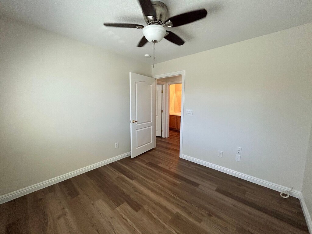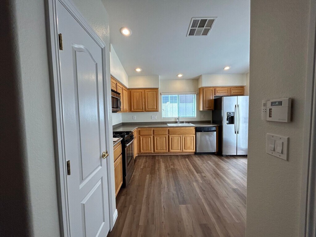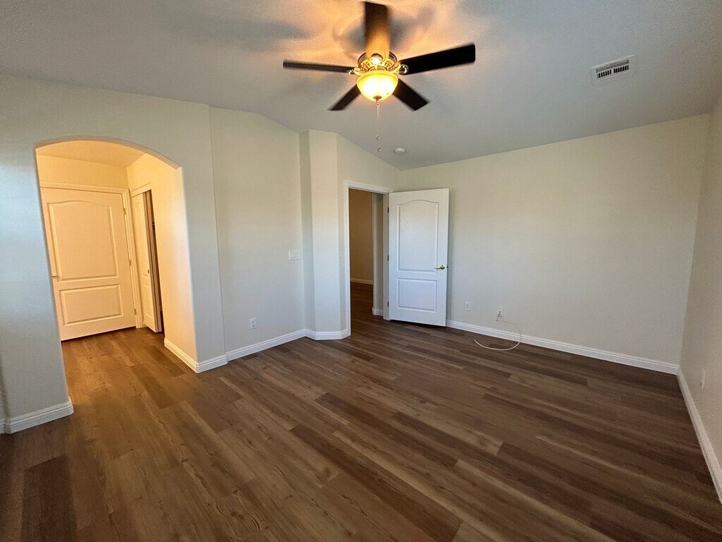 Welcome to this beautifully maintained 3-bedroom, 1.75-bath single-story townhome with a 2-car garage. This home features luxury vinyl plank flooring throughout and ceiling fans in every room for added comfort. The spacious kitchen offers solid surface countertops, stainless steel appliances, and plenty of room for cooking and gathering. The primary bedroom is separate from the secondary bedrooms, providing added privacy. Enjoy a low-maintenance back patio, perfect for relaxing. Don’t miss out Please note that the rent includes an additional $100 per month for sewer, trash, and the Resident Benefit Package(RBP). Please call with any questions.