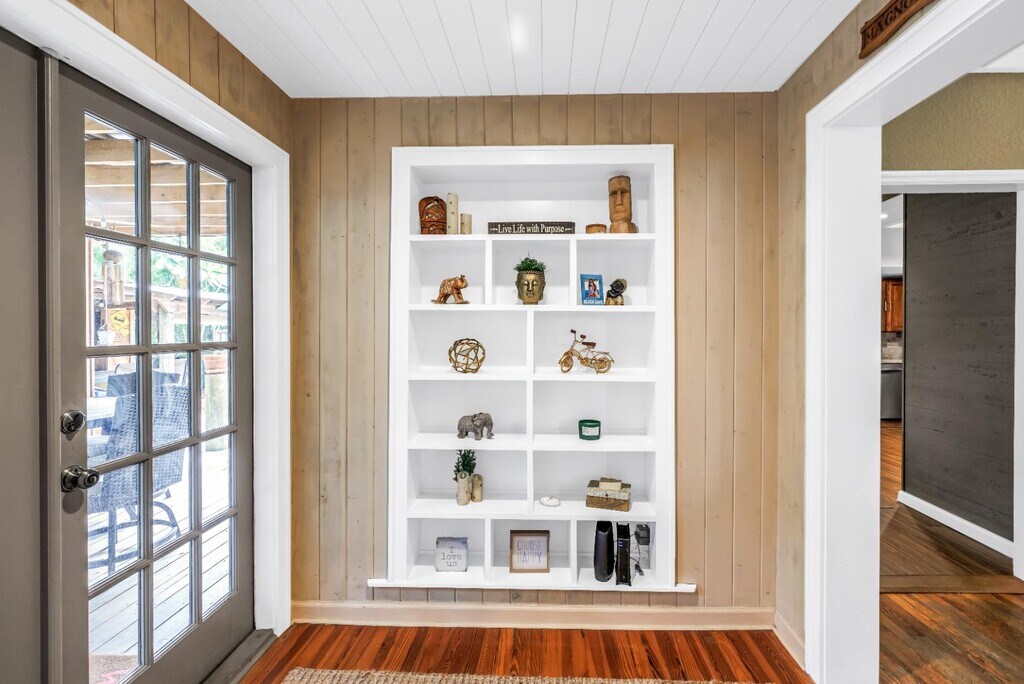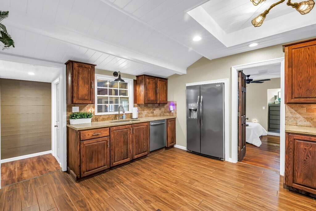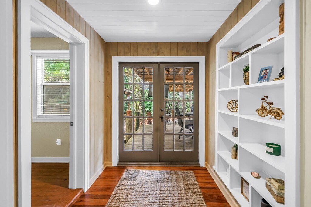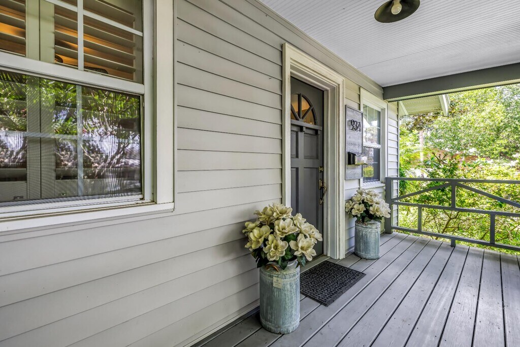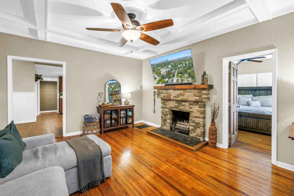 Privately positioned on an oversized corner lot in a non-flood zone, the home offers a curated lifestyle where style meets intention. From the moment you step onto the covered front porch, you'll feel the warmth of original hardwood floors underfoot, the charm of a classic woodburning fireplace, and the natural light spilling into a living space made for connection and comfort. The kitchen features stone countertops, wood-look tile, and stainless-steel appliances—designed for both the passionate cook and the everyday meal prepper. A quaint dining space sits just off the kitchen, with a laundry/utility room offering storage. Walk out from the kitchen to your private backyard oasis, perfect for hosting unforgettable evenings under multiple covered patios. Enjoy cocktails at your outdoor bar, cozy up around the firepit, and watch TV outdoors for game day or movie night in extremely private settings. A dedicated outdoor half-bath, potted plants, and charming signage are all included. Insi