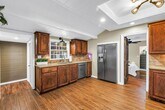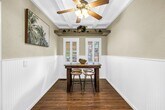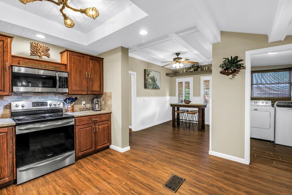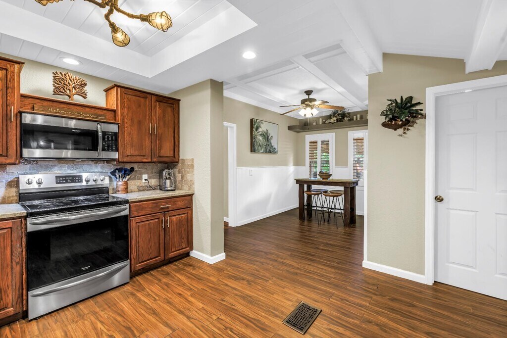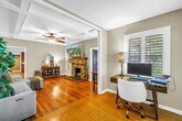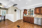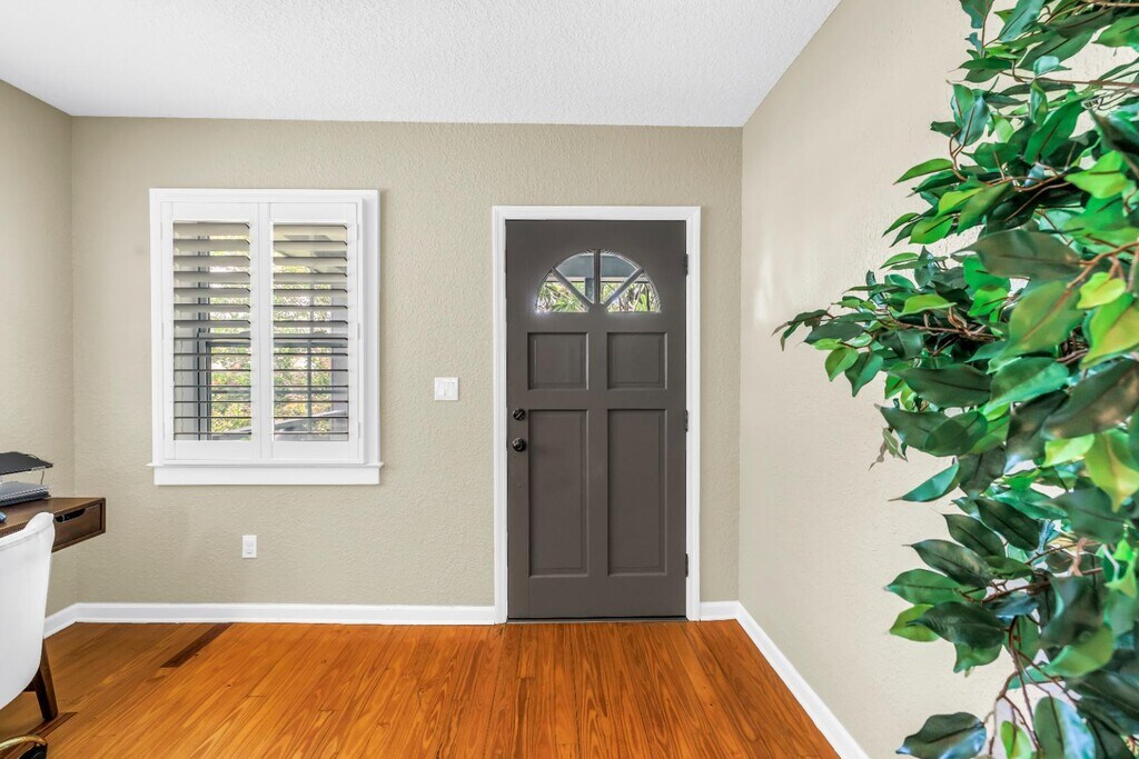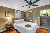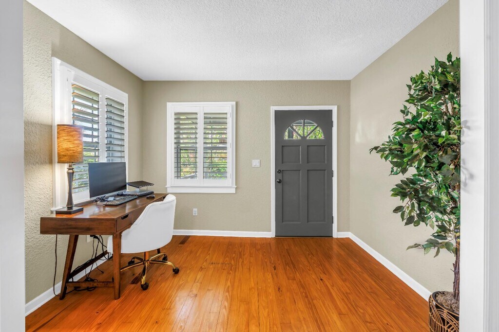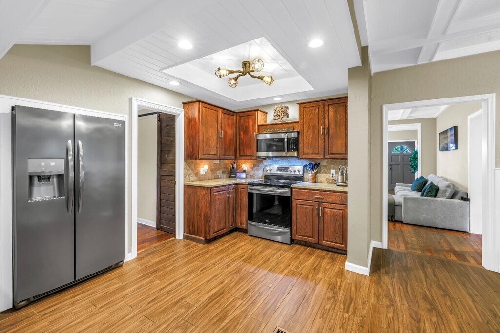 Privately positioned on an oversized corner lot in a non-flood zone, the home offers a curated lifestyle where style meets intention. From the moment you step onto the covered front porch, you'll feel the warmth of original hardwood floors underfoot, the charm of a classic woodburning fireplace, and the natural light spilling into a living space made for connection and comfort. The kitchen features stone countertops, wood-look tile, and stainless-steel appliances—designed for both the passionate cook and the everyday meal prepper. A quaint dining space sits just off the kitchen, with a laundry/utility room offering storage. Walk out from the kitchen to your private backyard oasis, perfect for hosting unforgettable evenings under multiple covered patios. Enjoy cocktails at your outdoor bar, cozy up around the firepit, and watch TV outdoors for game day or movie night in extremely private settings. A dedicated outdoor half-bath, potted plants, and charming signage are all included. Insi