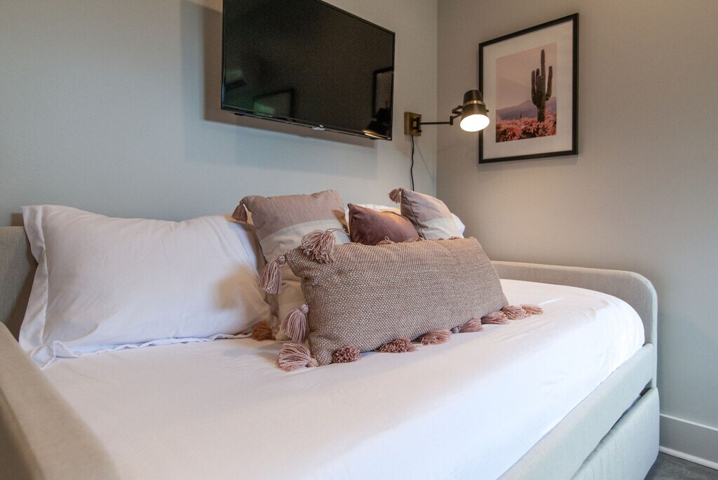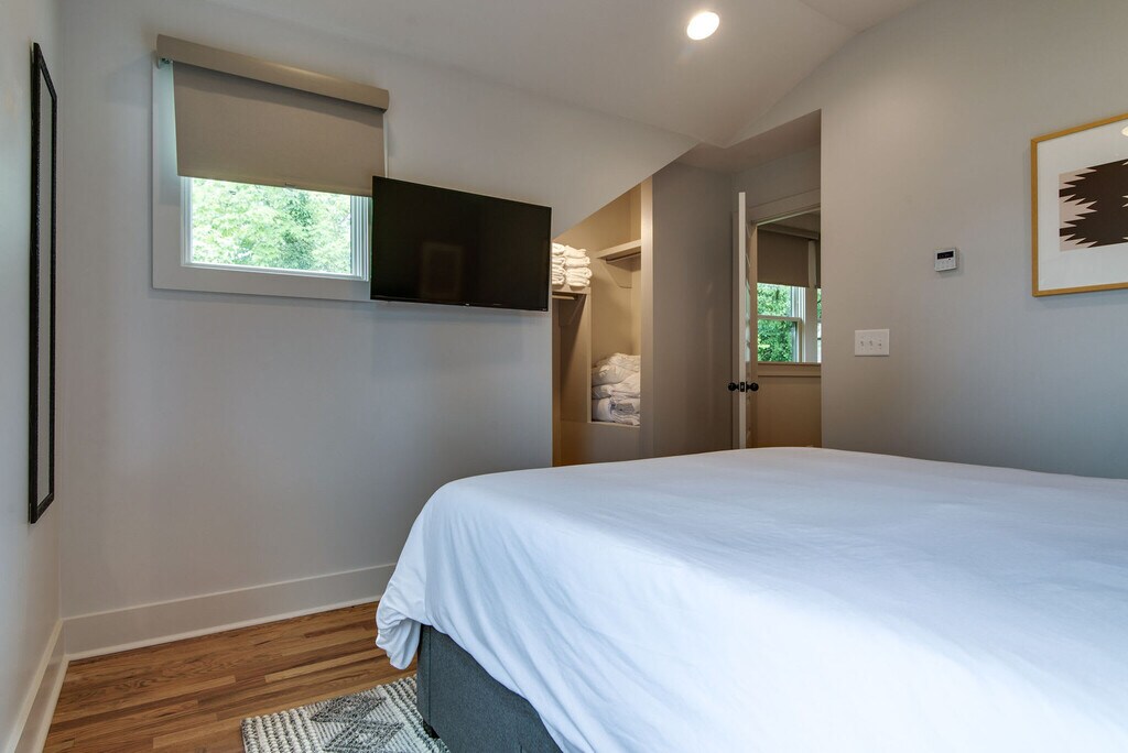 Feel at home in The Cleveland, a modern East Nashville townhouse. This haven for digital nomads or students features versatile sleeping options and a fully equipped kitchen. This townhouse features a cozy den with stylish daybeds, a plush velvet sofa in the main living area that transforms into extra sleeping space, and a fully equipped kitchen with modern appliances and essential cookware. Enjoy smart TVs in every room and complimentary high-speed internet throughout your stay. The primary suite includes a spacious walk-in closet and the option for a luxurious bath. Enjoy the convenience of a private 1-car garage. Located just moments from Broadway and within easy walking distance to local spots like Mas Tacos Por Favor and The Pharmacy Burger and Beer Garden, this home places you right at the heart of Nashville's buzzing energy and delectable eats. It's also minutes from Five Points, a vibrant neighborhood for food, live music, and local shopping, and less than 12 minutes from the Grand Ole Opry. Construction has recently started near the home, and some disruption should be expected Monday through Friday between 7 am and 7 pm. Registration Number: [SI]