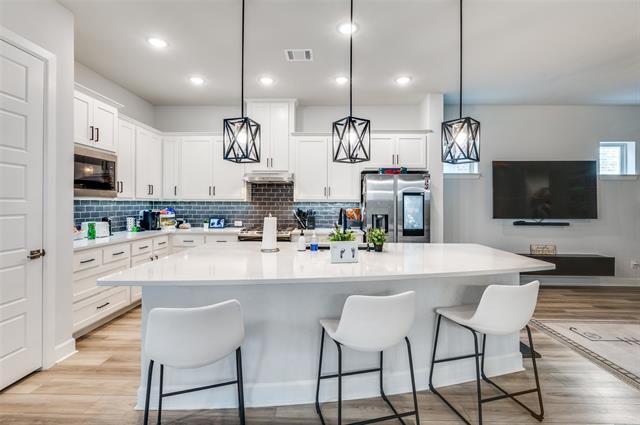 Welcome to 9349 Loggerhead Way in the highly desirable Lakes of River Trails community. This spacious 3-bedroom, 2.5-bath residence includes a study enclosed with French doors & custom cabinets, offering the perfect flex space for a home office or guest room. The open-concept floor plan blends functionality with elevated design, featuring luxury plank flooring, 8’ interior doors, and upgraded lighting throughout.The gourmet kitchen is a chef’s dream, complete with sleek quartz countertops, custom Pure White shaker cabinets, a Blanco Silgranit undermount sink in metallic gray, stainless steel GE appliances, pendant lighting, and an oversized island—ideal for both meal prep and casual gatherings. The living room features a striking fireplace with Emser polished tile surround and a painted floating box mantel that extends wall-to-wall for a designer finish. Retreat to the spacious owner’s suite, where you’ll find a spa-like bathroom featuring a drop-in soaking tub, separate rain shower with polished tile and pebble mosaic floor, dual vanities, and Moen brushed nickel fixtures. Secondary bedrooms are located upstairs, along with plush carpeting and ample storage space. Additional highlights include a turf-covered back yard, Custom shelves and cabinetry in study, covered patio, cedar garage door, energy-efficient systems, security system prewire, and a beautifully coordinated exterior with Casa Blanca brick and Country French stone. Located within top-rated HEB ISD and just minutes from trails, parks, shopping, and DFW Airport. Smart refrigerator and Samsung W+D convey with property.