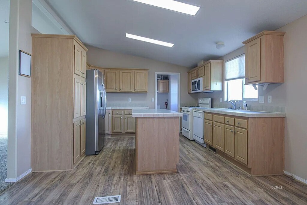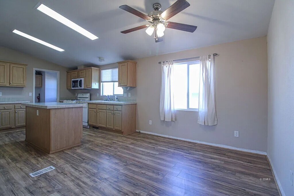 Manufactured Home on a Corner lot! The front living room has sunny windows and a ceiling fan. The kitchen offers solid surface counters, plenty of cabinets for storage, a range with microwave hood and an adjacent dining room with ceiling fan which then enters into the family room. The spacious family room has a warm inviting fireplace and ceiling fan. From the family room, lovely French doors open out to the generously sized back deck, a great space for entertaining! .All three bedrooms have ceiling fans for comfort. Both bathrooms offer vanities with sold surface counters. Also provided is a ramp for easy access to the front door. Home has an inside laundry room. Home comes with paid solar and AC. At Frontier Real Estate Services Inc., we strive to provide an experience that is cost-effective and convenient. That’s why we provide a Resident Benefits Package (RBP) to address common headaches for our residents. Our program handles air filter changes credit building and more at a rate of $35.00 /month, added to every property as a required program. More details upon application. In addition to RBP, we provide access to liability insurance that meets your needs. APPLY today at This home is ready to welcome its next residents. Call or Apply today!