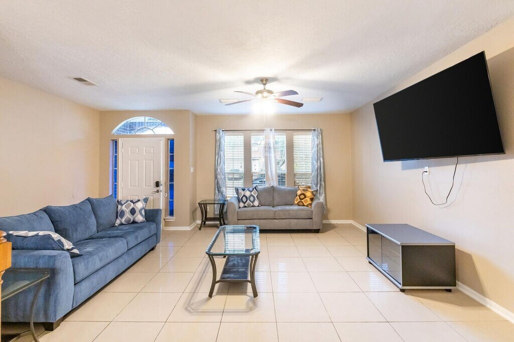 Feel at home in this spacious 3-bedroom, 2.5-bath Houston home. Designed for comfort, family gatherings, and business trips alike, this home offers over 2,300 sq ft of space to relax and enjoy your stay. This home features a cozy fireplace for relaxing evenings, a fully equipped kitchen with all essentials, and a washer and dryer for your convenience. It also has family-friendly amenities such as a crib and high chair. Pets are welcome with a $150 per pet fee. Free parking is available for up to 4 vehicles. Located in a quiet community close to tennis courts, parks, medical centers, and shopping at First Colony Mall and Memorial Park. Enjoy nearby restaurants, Bel-Air spas, and easy access to highways (8 & 59). Check-in is any time after 4 PM, and check-out is at 10 AM. Parties are fully prohibited, and quiet time is from 10 PM to 6 AM. There is a $300 penalty for smoking on the property, and you will be dismissed from your rental without a refund. There is a $250 penalty if noise level, parties, or other obscene behavior requires a police callout, and you will also be dismissed from the property without a refund. There is a $100 penalty for leaving trash outside the entrance to your property. Once your trash cans are full, please deposit trash in the large trash cans located at the building entrance. Please do not throw trash, paper towels, or toilet paper in the toilet to avoid clogging. Damage to the interior of the property or common areas will result in a pro-rated auto-chargeback from your booking account. On checkout, please turn off the lights, the A/C unit, water, and gas/stove, and lock the door behind you. Fast Wi-Fi and a workspace are available for remote work needs.