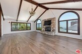 Gothic-Inspired home with Panoramic Views in Prime BHPO. Set high above the city in a peaceful & private enclave of Beverly Hills Post Office, this striking 3 bed + 3.5 bath + bonus room home blends dramatic Gothic-inspired architecture with modern luxury. Designed by a celebrity designer, the residence showcases custom wood detailing & breathtaking 180 views of the city skyline, ocean & canyons from every room. The expansive living room with soaring beamed ceilings is filled with natural light, featuring a stunning stone fireplace, oversized windows framing Downtown LA, & seamless flow into the dining area & out to an entertainer's dream deck. Spanning almost the entire length of the home, the deck offers unobstructed panoramic views & is ideal indoor/outdoor living. The chef's kitchen includes high-end stainless-steel appliances, tons of cabinetry, stylish tile flooring, & a bay window with hillside vistas. A convenient door opens directly to the deck perfect for morning coffee or al fresco dining. The primary suite is a true retreat, with a full wall of windows showcasing sweeping city & hill views, a massive walk-in dressing room with custom built-ins, & an additional wall of closets, ideal for the fashion-forward tenant. The spa-like en-suite bath is beautifully renovated, featuring double sinks, intricate tilework, a soaking tub inside the shower, & a bay window overlooking the treetops & skyline. The main level also includes a light-filled 2nd bedroom with built-ins, a fully renovated hall bathroom with skylight, & a chic powder room. Downstairs offers the 3rd bedroom en-suite with updated bathroom, a bonus room for a home office or creative space, a laundry room, & the direct access garage, complete with abundant storage & rubberized flooring, should you want to use it as a home gym. Surrounded by prestigious estate properties, this one-of-a-kind residence offers privacy, incomparable design, & effortless access to the best of Beverly Hills, the Valley, West Hollywood & the Westside. Some photos have been virtually staged. MLS# 25559063