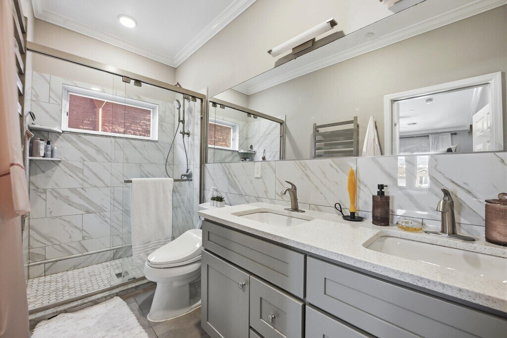 936–938 Pavonia Ave introduces modern luxury in the rapidly growing Journal Square/West Side area. This boutique 8-unit elevator building is just an 8-minute walk to the JSQ PATH and near the upcoming West Side Square development. Solid brick construction with private gated parking, bike room, and 24/7 video security. Unit 3B is a bright 2 bed, 2 bath home with approx. 1,044 sq ft plus a private terrace. South-facing sliding doors flood the space with natural light. The custom kitchen features Calacatta quartz countertops, designer backsplash, Samsung appliances, wine fridge, and Kohler fixtures. The primary suite offers a walk-in closet and spa-like bath with double vanity, glass shower, heated floors, and premium finishes. Additional highlights include white oak floors, recessed lighting, Pella windows, central HVAC, Nest thermostat, tankless water heater, and in-unit washer/dryer. Located on a quiet, tree-lined street near schools, dining, and shopping—this is elevated urban living.