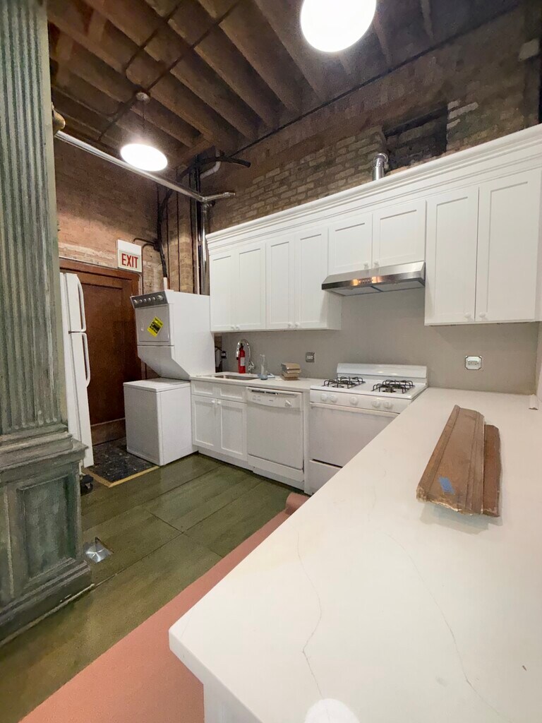 Located in the heart of Lakeview at 936 W Roscoe St, Unit 1R, this stunning industrial loft perfectly balances raw architectural character with modern convenience. Available starting June 15th, the expansive main living area immediately impresses with its soaring exposed wood-beam ceilings, rustic brick walls, and massive windows that bathe the space in natural light. The interior features unique polished green-tinted concrete floors and a dramatic, floor-to-ceiling vintage built-in shelving unit that serves as a one-of-a-kind centerpiece. This aesthetic is complemented by a contemporary, bright white kitchen equipped with a gas range, dishwasher, and a convenient in-unit laundry center. The updated bathroom continues the sleek themeBeyond the main level, a finished bonus space with durable epoxy flooring offers the perfect footprint for a quiet home office, creative studio, or media room. Tucked away on a beautiful tree-lined street just steps from the vibrant dining and transit options of Clark and Belmont, this residence offers a truly distinctive urban living experience. Cats are allowed and garage parking is also available for convenience.