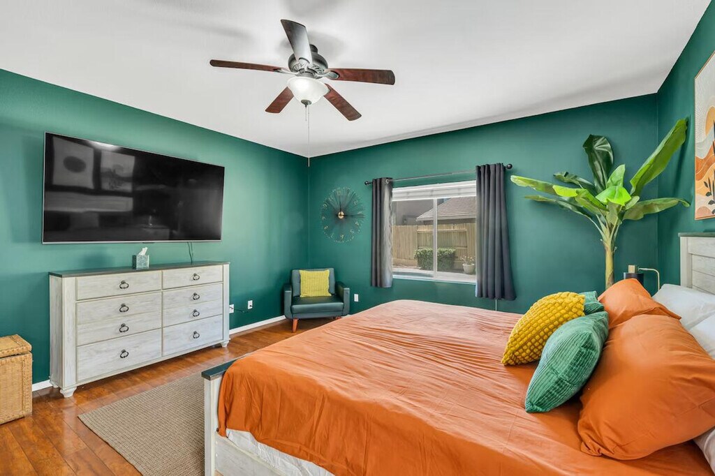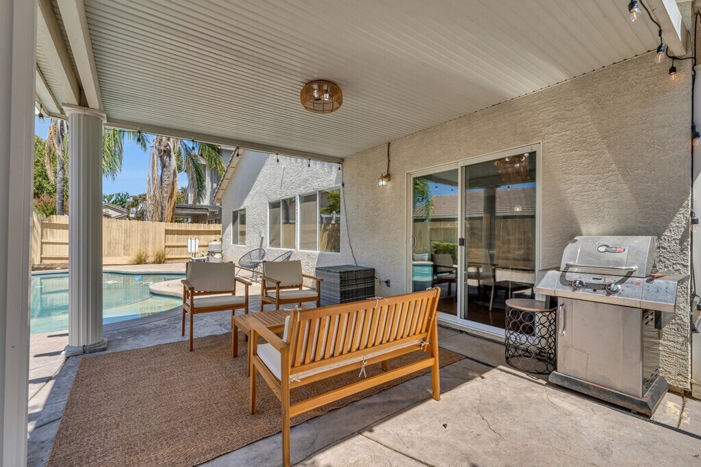 The advertised rate of $5,398/month is the lowest available price, based on a 30 day(s) stay with a move-in date of March 7, 2026. Rates vary depending on the duration of stay, season, and other parameters. For exact pricing and additional pricing components, please visit our website and enter your desired move-in and move-out dates. The rate is applicable when billed upfront; it can be higher if billed in multiple payments. Feel at home in this single-story house in a quiet neighborhood in Elk Grove, featuring 3 bedrooms and 2 full baths. This house is fully stocked with pots, pans, plates, bowls, utensils, and cups for all your kitchen needs. A Nespresso machine, tea kettle, and air fryer are available. The dining table fits 6 people. The living room has a 65-inch TV, and the master bedroom has a 70-inch TV, a private bathroom, a walk-in closet with a crib, and an outdoor area with a barbecue grill, outdoor seating, a fire pit, and a pool. Each room comes with bedding and towels, and each bathroom comes with shampoo, body wash, and conditioner. Enjoy a barbecue by the pool in the backyard. You can park two cars in the garage, two cars in the driveway, and three cars on the street. The next bedroom features a floating queen bed. The master bedroom features a king-size bed with a walk-in closet and two-sink vanity, and a separate bathtub and shower. The kids' room features a trundle bunk bed and a desk. [SI]