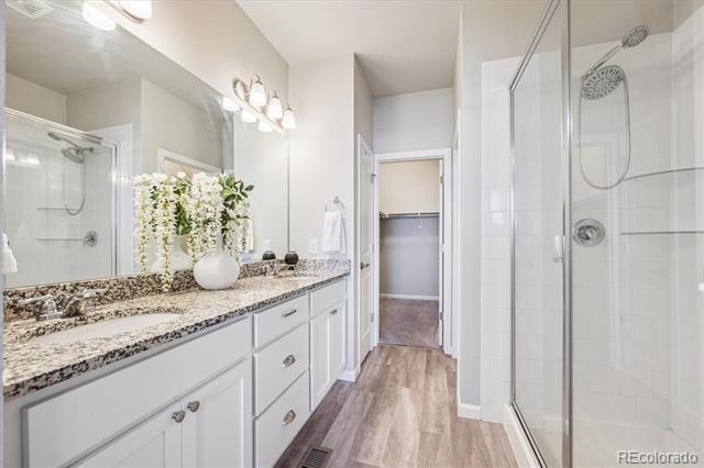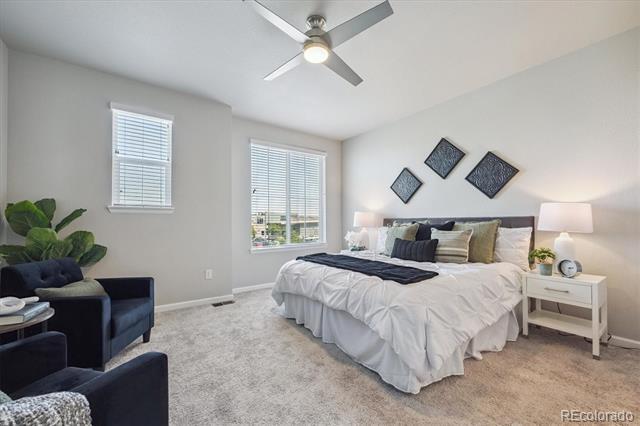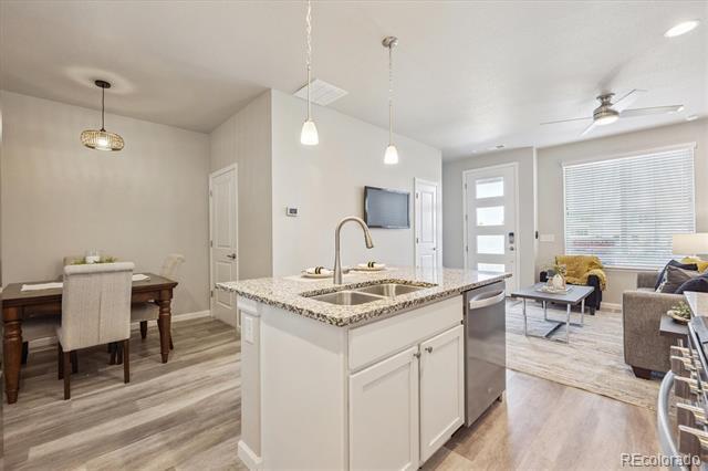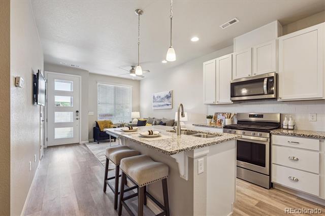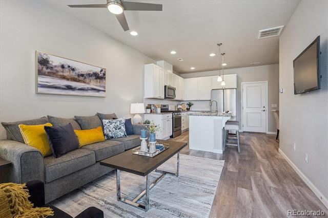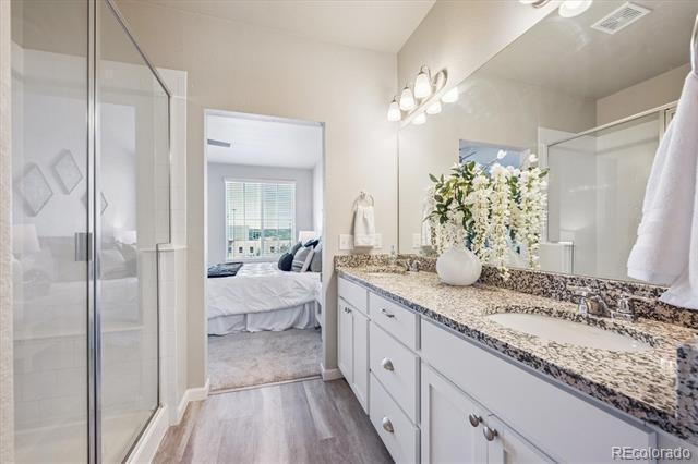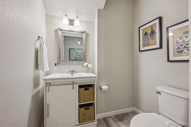 Step inside to this spacious and well-maintained open townhome with laminate flooring throughout the main level. Cozy, practical living room with large picture window. Conveniently located powder bath on main. Large kitchen features island, white cabinets with quartz counters, and stainless steel appliances flowing into the open dining area with access to the garage. Upper level offers primary bedroom with ensuite bath & spacious walk-in closet! Additional generous spare bedroom with ensuite bath and large closet! Laundry room fits side by side with built-in shelving. The two car garage offers ample storage space. Live close to excellent JeffCo schools with tons of conveniences to shops, dining, grocery, parks and trails! Don't miss this one! Call Stacey Bushaw with all showings! Townhouse MLS# 8471745