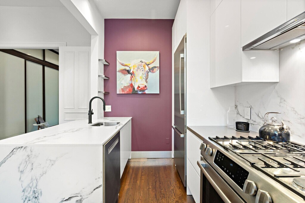 A rare opportunity to lease a fully furnished home in a classic uptown Hoboken brownstone—perfectly situated among the city’s best restaurants, parks, and waterfront paths. This beautifully renovated residence features 11-foot ceilings, a spacious entry framed by custom glass sliding doors, and a chic kitchen/dining area with Porcelanosa cabinetry, Bosch and Miele appliances, and quartz countertops with a waterfall peninsula. Hardwood floors run throughout, complemented by two sets of 9-foot French doors that offer flexible living and privacy. The bedroom includes a striking custom built-in bookcase, while the bright living room showcases an original mantel and historic molding. The bathroom is elegantly finished with Porcelanosa and Kohler fixtures and crystal pendant lighting. New Marvin windows and a unique extra storage/crawl space add even more convenience. Located directly across from the uptown bus stop with easy access to the ferry and PATH, this home delivers both charm and commuter-friendly convenience. Available fully furnished, for short-term or one-year leases. Short-term rate: $4,250/month including utilities up to $250.