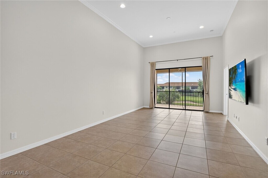 Experience an endless vacation of resort-style living in this second floor condo in Esplanade Golf & Country Club in North Naples. The condo is available as an ANNUAL rental. Enjoy eastern facing golf course views of the 15th green with a lake in the background from the balcony and primary bedroom. This unfurnished,freshly painted two bedroom and den,two bath condo comes with a social/sports membership which allows access to the large resort-style pool with cabanas and the poolside “Bahama Bar”,Har-Tru tennis courts,pickleball,bocce,full spa and salon,fitness center,dog park,14 miles of trails,and limited access to 18 hole golf course,restaurant with casual to fine dining,bar,and wine tasting room. There is always something to do or explore in Esplanade! The open floorplan condo has vaulted ceilings,sliding glass doors to the balcony,large primary bedroom with 2 walk-in closets,en-suite bathroom with dual vanities,guest bedroom and guest bathroom,laundry room with washer/dryer,and a detached one car garage. The kitchen consists of granite countertops,GE stainless steel appliances,brand new dishwasher,breakfast bar,and kitchen nook. Esplanade is a gated community with the front gate attendant 24/7.