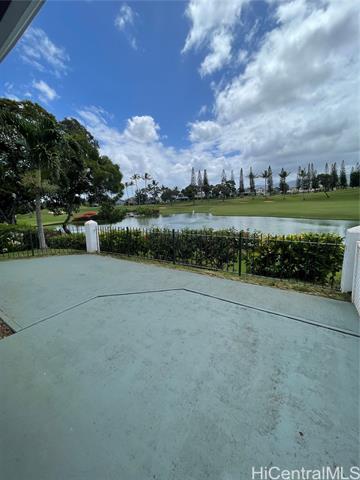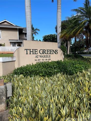 Located next to Waikele Outlet Mall! Large 2 bedroom 2 1/2 bathroom townhome in Greens at Waikele! Corner end unit with spacious wrap around yard. On top of Waikele Country Club's signature hole (#4). Ceramic tile and laminate flooring throughout entire home. Stainless steel appliances, plantation shutters, window a/c, ceiling fans, and a two car garage. Two more cars can be parked behind garage and visitor stalls are nearby. Just 15 minutes away from Schofield Barracks and 15 minutes away from Pearl Harbor and Hickam AFB. Five minute drive to Safeway, minutes away from Costco, restaurants and Central Oahu Regional Park. MUST SEE TO APPRECIATE!