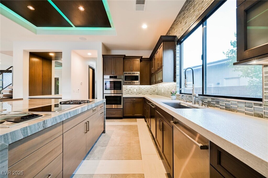 Possibly The Best home in Sterling Ridge @ The Ridges. No expense spared, with amazing designer finishes throughout. Large stylish kitchen with Center Island. Top-of-the-line Subzero and Wolf Appliances, solid counter tops and European style cabinetry. Bright, Open Spacious Great Room with double height ceilings, as well as a large pocketing glass walls to give you a seamless California in-door out-door lifestyle. Additional highlights include a big wet bar with seating for 5, wine cellar, a designer powder room for guests and a modern floating staircase with fountains at the base, adding a relaxing vibe. The Primary Suite is to die for, with large walk-in closet, retreat/sitting room, separate from all other rooms and offers a private balcony! One large guest bedroom with full bath attached on the main level. Oversized Yard with a long driveway for extra parking, beautiful covered patios overlooking the stylish swimming pool, spa, Summer Kitchen/BBQ, and sports court on the side yard.