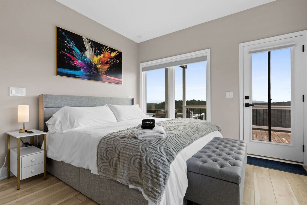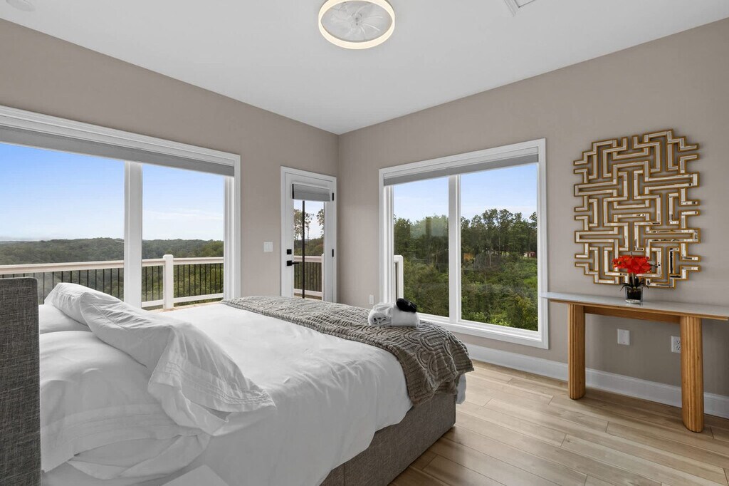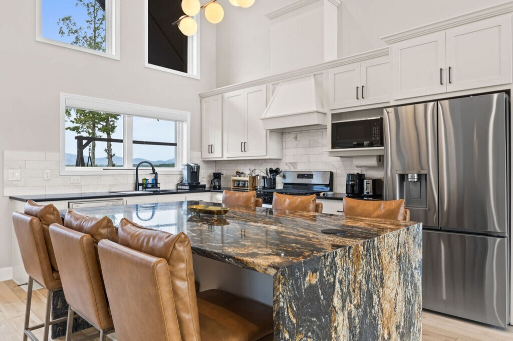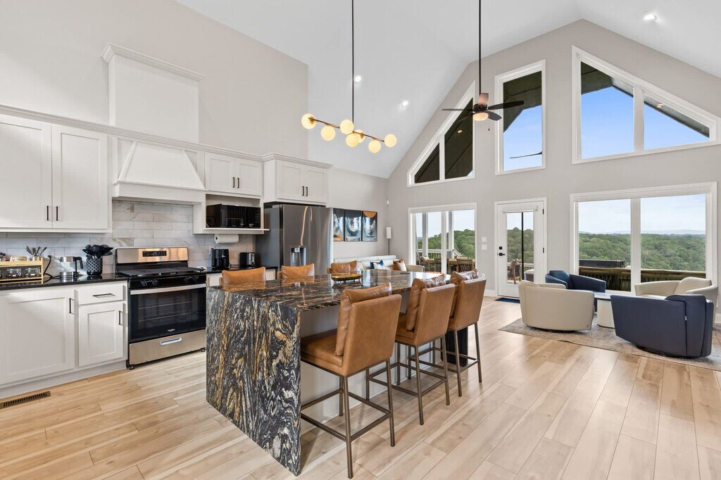 Feel at home in this 3-bedroom home in Ellijay, GA, located in the brand-new Jake’s Landing Overlook Community. This beautiful 2-level home offers the perfect balance of comfort and convenience for families, couples, or small groups. Designed with a luxurious yet modern set-up and thoughtful touches, this retreat is perfect for both relaxation and adventure. The home features a fully stocked kitchen, a living room with a 75” smart TV, a game room with a pool table, arcade games, and a treadmill, and a movie theater with a projector and 7 reclining chairs. Step outside to enjoy the wraparound deck complete with a hot tub and firepit, an outdoor patio/dining area, a BBQ grill, a hammock, a swing, and a giant Connect 4. Two EV chargers are available for use. Nearby attractions include Veterans Memorial Park (1.7 miles), Downtown Ellijay (5 miles), Apple Orchards (6–8 miles), Roo Mountain Vineyards (8 miles), Big Bald Mountain (10 miles), and Fort Mountain State Park (13 miles). Restaurants in the area include Back Porch Bistro, Cajun Depot, River Street Tavern, Big Bear Ellijay Bar & Grill, Ellijay Tapz, and The Roof, all approximately 5 miles away. No pets are allowed. Parking is available in the driveway and parking lot for a maximum of 3 cars. Guests must be 21 years or older to book this property. Guests are kindly asked to bring their own EV charger cables and firewood for the fire pit. No parties are allowed—violations may result in immediate termination of the stay. A few extra cameras are installed solely to monitor the cleaning team for quality and security purposes. Check-in is at 4pm and check-out is at 10am. Includes a dedicated workspace in the basement. [SI]