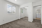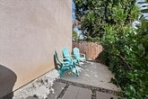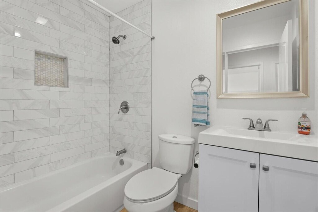 This modern, completely detached single family home offers a thoughtful layout, private outdoor space, and the convenience of a garage with in unit laundry. The main level features an open living area with wood style flooring, recessed lighting, and a sleek kitchen with white cabinetry, quartz style counters, stainless steel appliances, and tile backsplash. A half bathroom is located on the first floor for guests. Upstairs includes three well sized bedrooms, including a primary suite with sliding doors to a private balcony, mirrored closets, and a contemporary en suite bath. The secondary bathroom feature clean tile finishes and modern fixtures. Enjoy a private back patio tucked behind the home, perfect for enjoying the LA weather. Washer and dryer are located in the attached private two car garage. One of only two homes on the lot, offering privacy and a true single family feel.