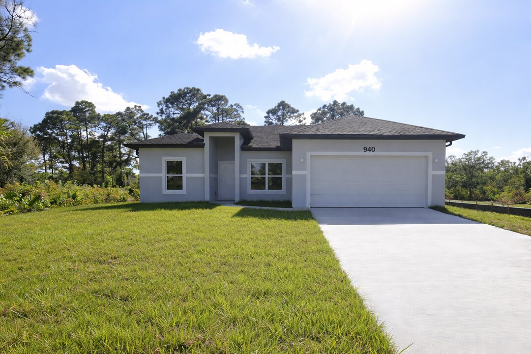 Welcome to your brand new home in Lehigh Acres, FL! This spacious 4-bedroom, 2-bathroom house is ready for you to be the first to call it home. The modern open floor plan features a great room and gourmet kitchen with a large island, perfect for entertaining. The kitchen is equipped with stainless steel appliances, granite counters, and a full appliance package, including a large pantry. The primary bedroom boasts an en-suite with dual vanities, a large tiled shower, and his and hers closets. The house also features a large inside laundry room with washer and dryer hookups, a two-car garage, and a covered rear lanai. There is beautiful tile flooring throughout the home, coffered ceilings in the primary bedroom and great room, and modern lighting and fixtures add a touch of elegance. The house is pet-friendly and comes with impact windows for storm protection. Located close to SR 82, it offers easy access to FT Myers and all amenities in Lehigh Acres. With a large backyard and lots of natural lighting, this house is one of the lowest-priced new constructions in the area. Don't miss out, see it today!