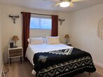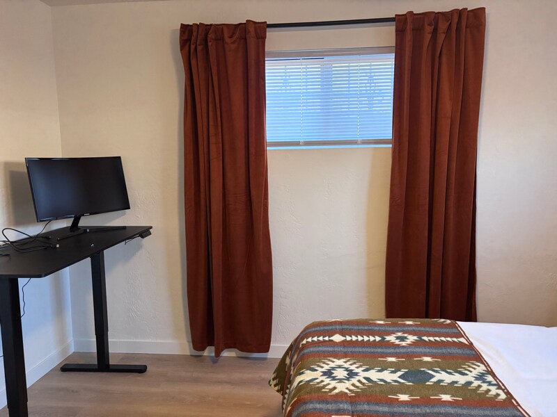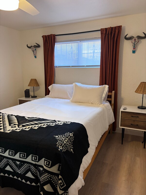 Property Id: 2027058 Newly renovated furnished 2BR/1BA duplex with 850 sq ft and Southwest decor featuring art by Francisco Martinez. Both bedrooms have queen beds. Adjustable standing desk for work. Enjoy full privacy with your own fenced yard, separate entrance, and dedicated parking. Includes two outdoor seating areas and sits directly across from a park. Quiet, comfortable, and ideal for travel professionals. Min credit score 620, Min Income req per mo $4350.