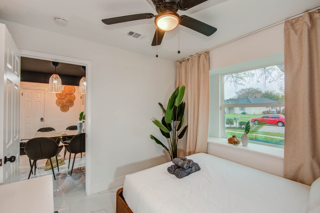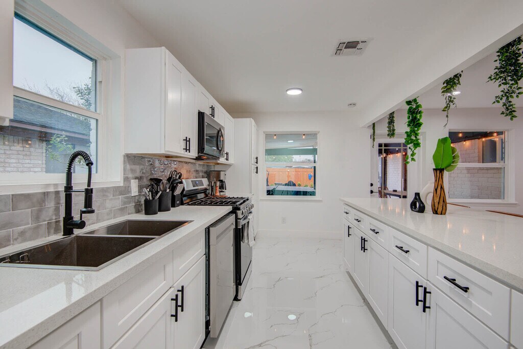 Welcome to your home away from home in Houston! This vacation home features a beautiful open-concept layout and five bedrooms, offering plenty of sleeping space. Nestled conveniently between the 610 Loop and Beltway 8 in the centrally located community of Spring Branch, you’re only minutes from some of Houston’s prime attractions. This home caters to both short-term and medium-term stays, making it an excellent choice for corporate housing needs. The fully equipped kitchen has everything you need to whip up a tasty meal, including stainless steel appliances, basic cooking essentials, and a kitchen island with seating for three. The living room invites you to sit back and relax with its comfortable couch, coffee tables, ottoman, designer rug, and high-speed Wi-Fi. Enjoy the backyard with a fire pit, lounge chairs, private jacuzzi, furnished patio area, and outdoor swimming pool. A washer and dryer are available for your use. House-trained pets are welcome with a non-refundable pet fee of $150 per pet (maximum of 2 pets per stay). Located only minutes to downtown and the Energy Corridor, you’ll find an abundance of family-friendly activities and community appreciation here. Nearby attractions include The Houston Museum of Natural Science, Minute Maid Park, and exciting neighborhoods such as Midtown, Washington Avenue, and Montrose for great restaurants and lively bars. Smoking of any type is not allowed and violations are subject to a $450 fine plus the cost to clean, deodorize, and repair damages. Only registered guests are allowed on the property. A noise alert device is installed in the home to comply with local noise ordinances and occupancy regulations. The device measures decibels and sends alerts if reasonable noise levels are exceeded. Check-in is at 4pm and check-out is at 10am. Registration Number: STR-2025-000412 [SI]