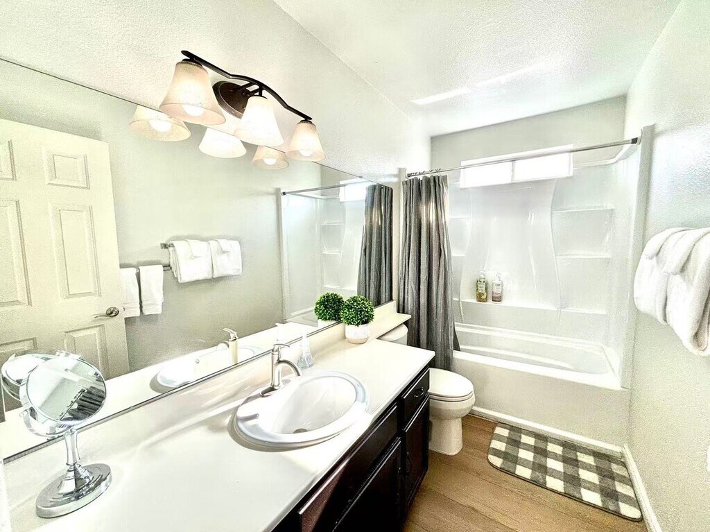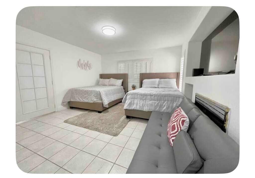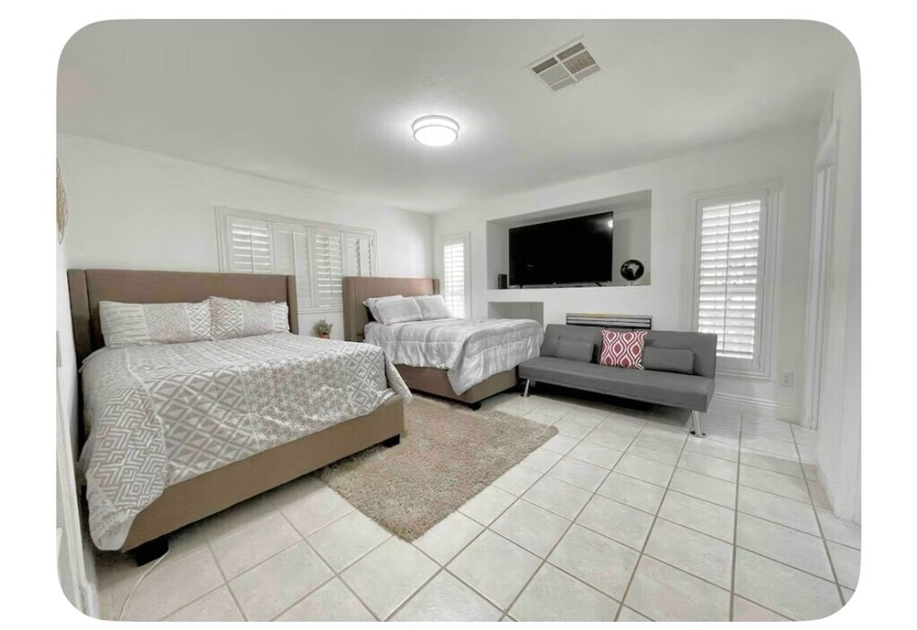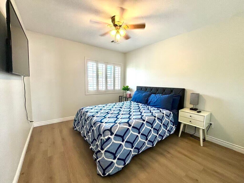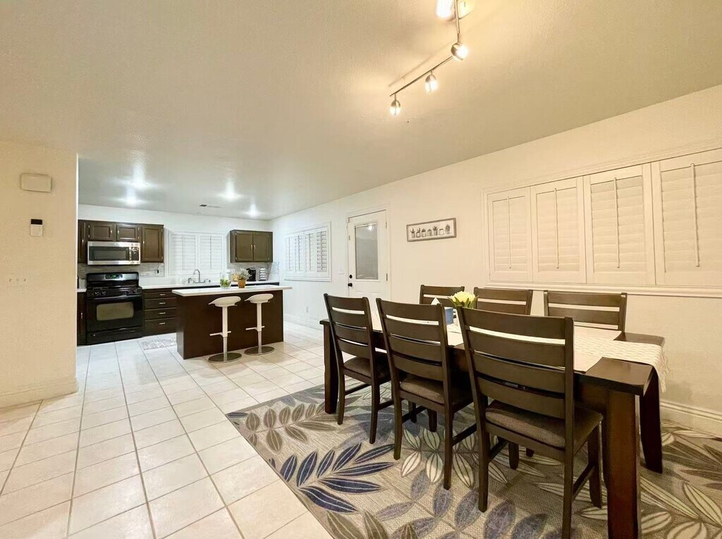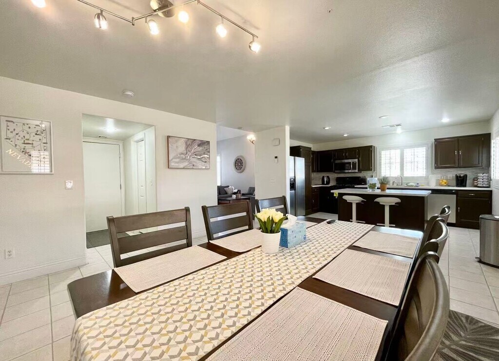Fabulously renovated 4-bedroom, 3.5-bath home located in a highly desirable neighborhood. Well-designed floor plan includes an ensuite bedroom on the first floor, perfect for guests or multi-generational living. Shutters throughout, separate dining area, and vaulted ceiling living room perfect for entertainment. The full-size kitchen features a stainless steel double sink, ample cabinetry, and plenty of counter space for cooking. Upgraded with vinyl flooring on the stairs and throughout the second floor, plus durable tile flooring downstairs, making maintenance and cleaning a breeze. Shutters throughout add a stylish and functional touch. Step outside to a spacious backyard with a covered patio, perfect for relaxing evenings, BBQs, or gatherings. Situated on a corner lot, the property offers easy access and added privacy. Great Proximity to Downtown Summerlin, Red Rock Casino, Tivoli Village, Top Schools, Hospitals & the 215. Short-term price with furniture available. Please inquire. Referral Agent Commission: $400. Contact the listing OFFICE for any questions. Rent AS-IS. All applicants over the age of 18 must apply with front/back ID, last 2 months pay stubs & bank statements, and $65 NON-Refundable application fee. TENANT is responsible to pay a $50 monthly trash&sewer fee on top of monthly rent. $300 pet deposit per pet (small pets), $60 key deposit, $300 clean deposit, $300 utility deposit. Requirement: minimum 620 credit score for all applicant and monthly household net income 3x the rent. To apply, please visit . The fireplace is not operational. Short-term price with furniture available. Please inquire.