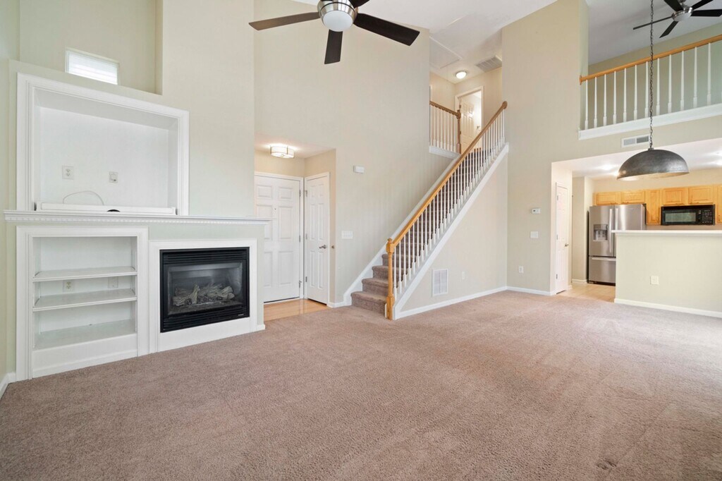 This pristine 2 bedroom 2.5 bath home with open floor plan and lots of natural light. Small fenced in yard ready to be made into private oasis has a 2 story great room with gas log fireplace, Kitchen has raised panel oak cabinets and New Vinyl flooring too, large loft area, Painted in neutral colors, New carpet throughout main level and upper level. New fixtures in upstairs bathrooms. Refrigerator & Washer/Dryer included, A two car garage with built in storage. Community amenities offer 5 pools, sports club/fitness center, miles of walking trails, golf course and tennis courts and so much more! *Pet Friendly Too With Dog Door*All Exterior Maintenance Included*