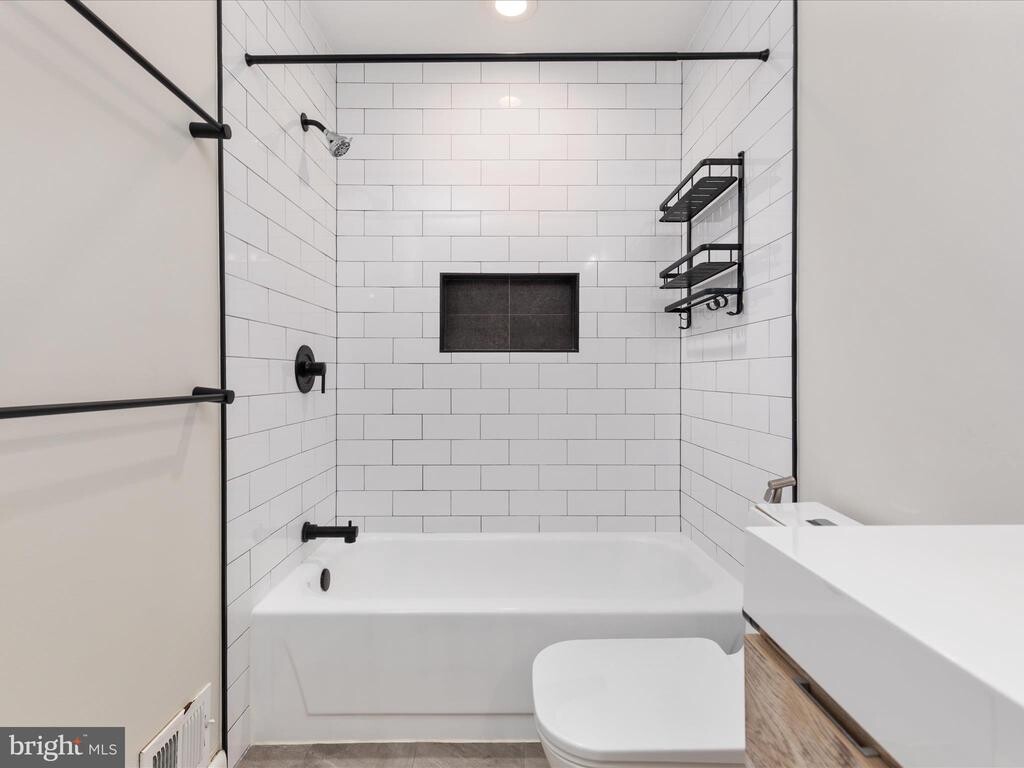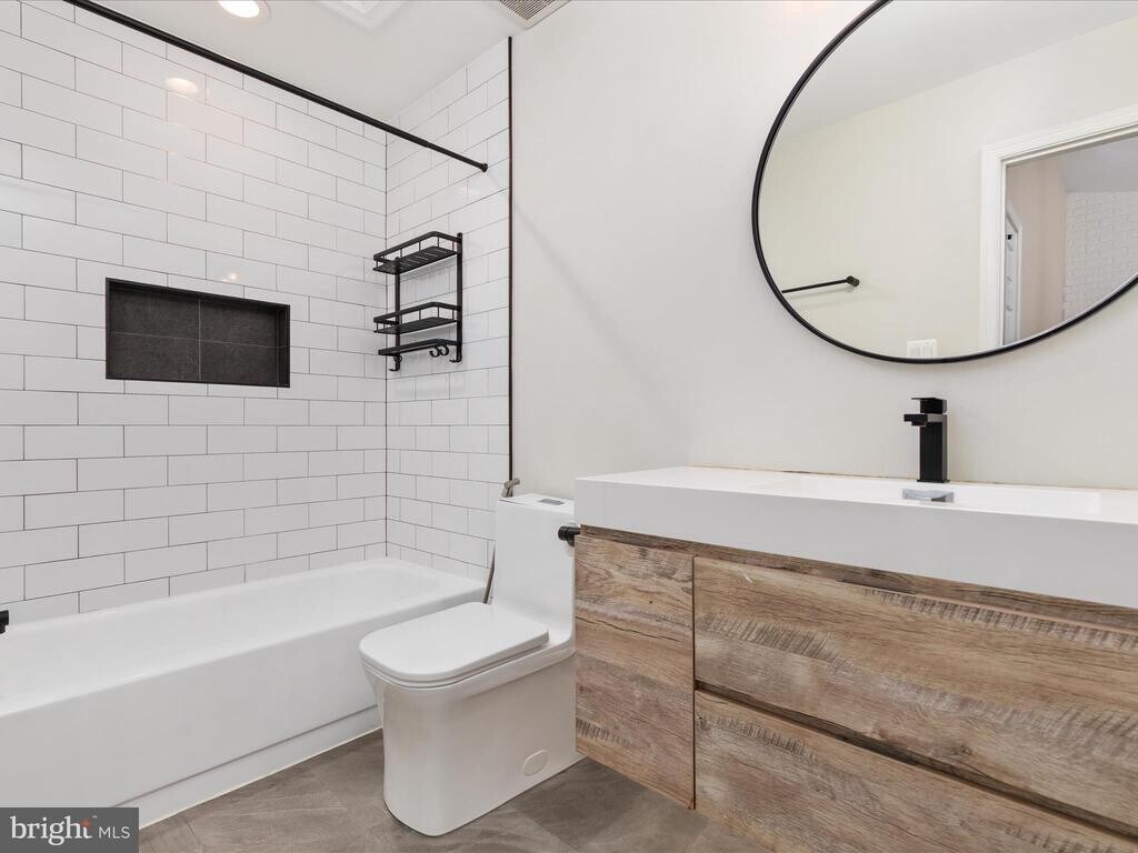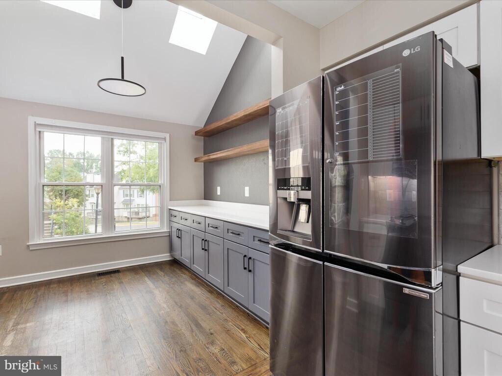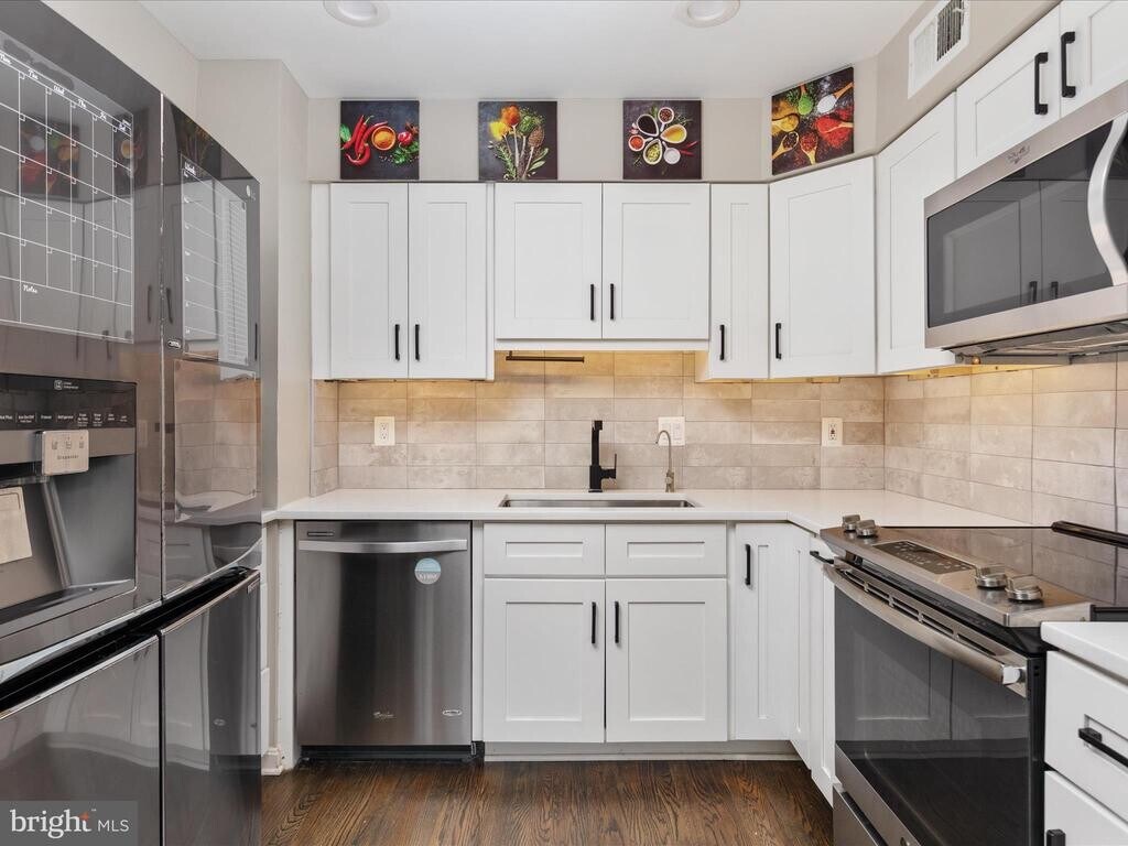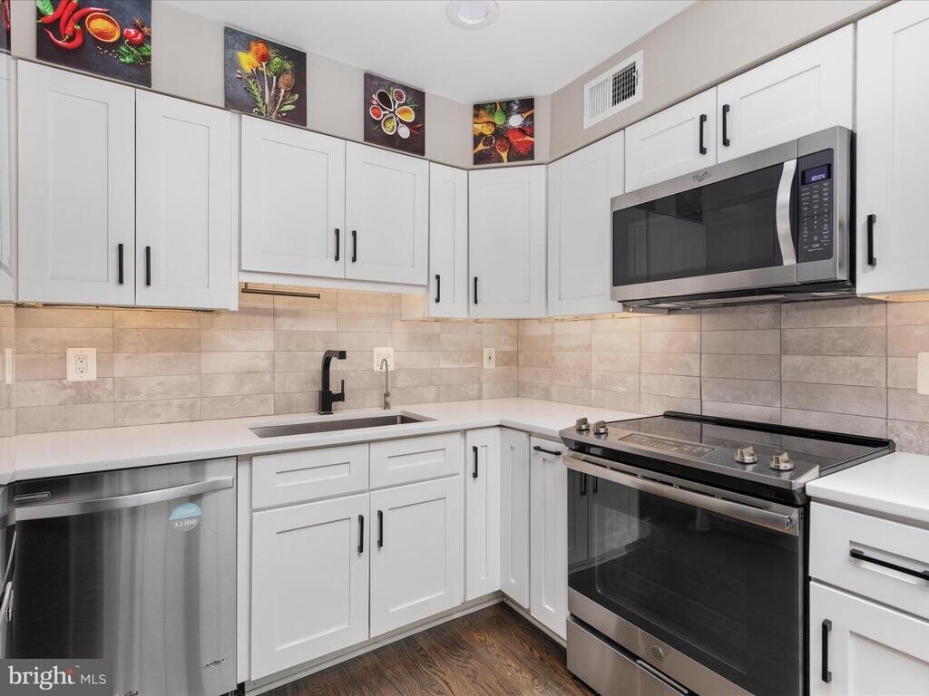 Must See! Stunning private end-unit townhouse backing to trees in the top-rated Lake Braddock School District. Completely renovated in 2019 with modern designer finishes throughout. The chef’s kitchen features white shaker cabinets, white quartz countertops, top-of-the-line stainless steel appliances, a stylish backsplash, deep inset rectangular sink with under-sink water filtration, and sleek black hardware and fixtures. Adjacent to the kitchen, the dining area shines with skylights and a full wall of gray shaker cabinetry topped with quartz counters—perfect for entertaining, storage, or multi-purpose use. The home boasts dark walnut hardwood floors on the main and upper levels. Upstairs, retreat to a spacious primary suite oasis with loft office/flex space, a walk-in closet, and a spa-like bath featuring a floating vanity, designer toilet, and soaking tub with subway tile to the ceiling. The main level offers two bedrooms and a designer hall bath with a floating vanity, LED lighted mirror, walk-in shower with framed glass door, and stylish tile. The finished lower level showcases upgraded LVP flooring and includes a flexible living area. The legal bedroom features a striking designer accent wall with a built-in electric fireplace and space for your flat-screen TV. A modern full bath and a laundry suite with upper cabinets, a second refrigerator, and additional designer cabinetry complete the level. Step outside to a private fenced backyard with a large deck, gazebo, and two storage sheds, all backing to tranquil woods. Conveniently located near shops, dining, and countless amenities—this home truly has it all!