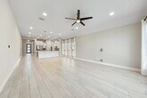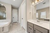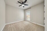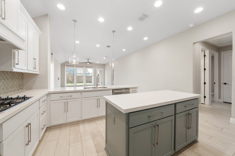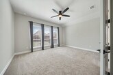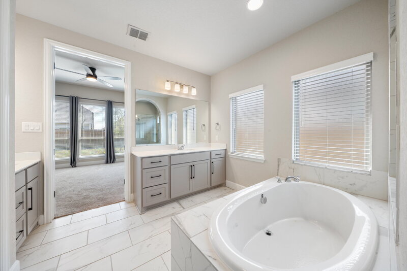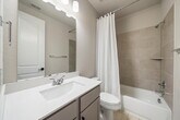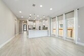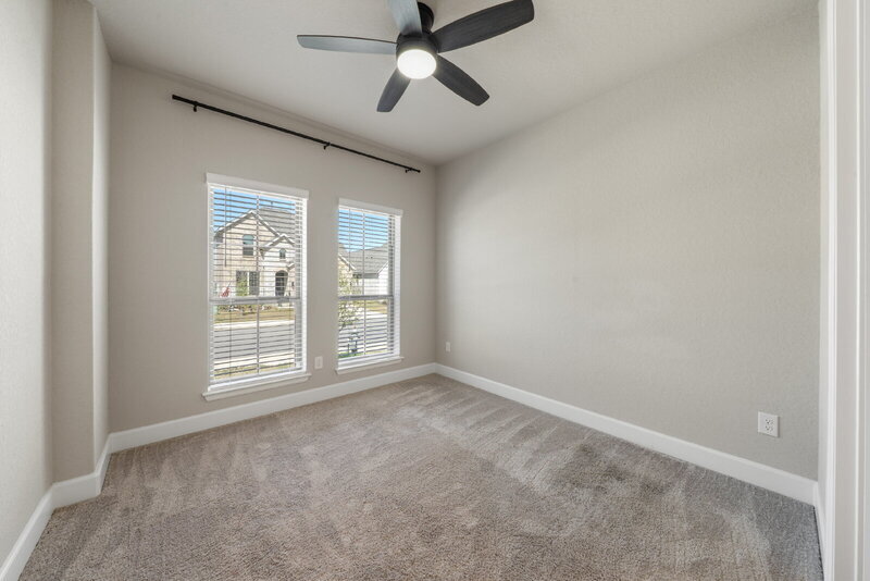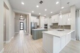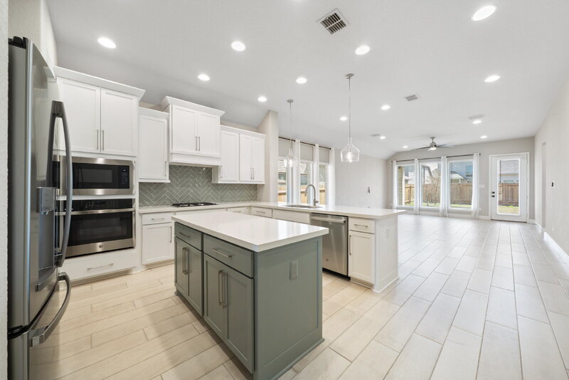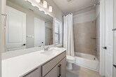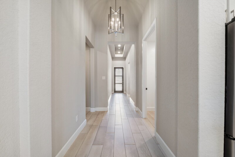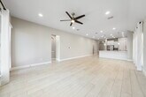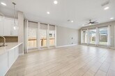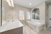 This spacious 4-bedroom, 3-bathroom home offers 2,049 sq. ft. of open living space with high ceilings and elegant finishes throughout. The extended entry features 12-foot ceilings, leading to an open kitchen, dining, and family room with large windows for natural light. The modern kitchen boasts quartz countertops, a stylish backsplash, stainless steel appliances, a built-in oven, gas cooktop, and a breakfast bar. The primary suite features double doors leading to a luxurious bath with dual vanities, a garden tub, a glass-enclosed shower, and a walk-in closet. A guest suite with a private bath adds extra convenience. Enjoy wood-look tile in living areas, carpet in bedrooms, a built-in shoe shelf and bench near the 2-car garage, and washer/dryer included. The large private backyard with a covered patio is perfect for outdoor relaxation. Community amenities include two pools, a dog park, and playgrounds.