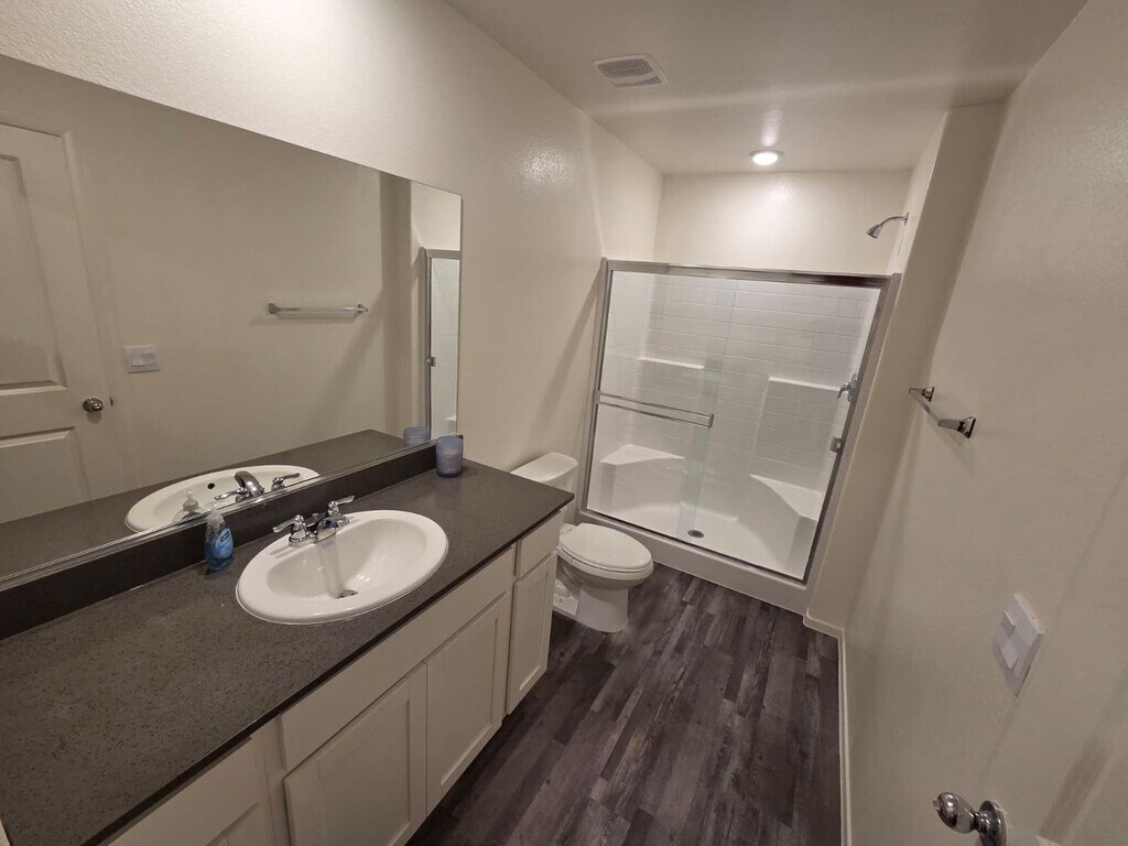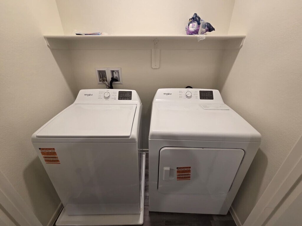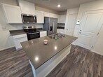 Brand new construction, never-lived-in two-story home featuring a modern open-concept layout and premium finishes throughout. This home offers a spacious kitchen with white shaker cabinets, quartz countertops, stainless steel appliances, a large center island, and a walk-in pantry. The main living area is bright and open with durable wood-style flooring and recessed lighting. Upstairs features plush new carpet, generously sized bedrooms, a versatile loft ideal for a home office or second living space, and a convenient upstairs laundry room with washer and dryer included. The primary suite includes a large walk-in closet and a modern bathroom with dual vanity and tub/shower combo. Additional highlights include a two-car garage, low-maintenance landscaping, smart thermostat, and a built-in alarm system for added security. This home is brand new and has never been occupied, offering a truly fresh start for its first resident.