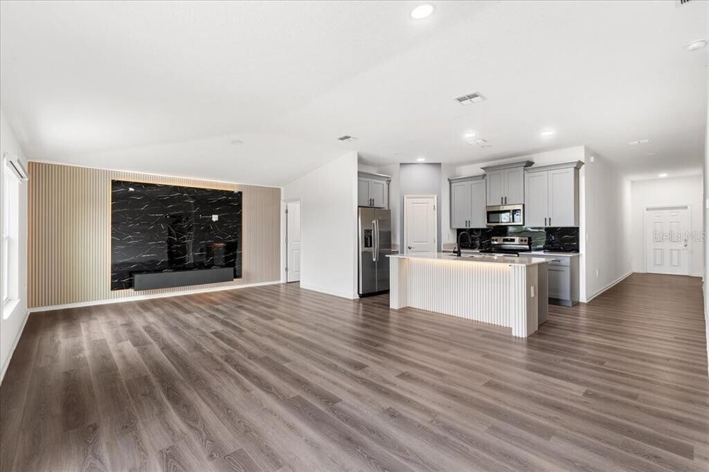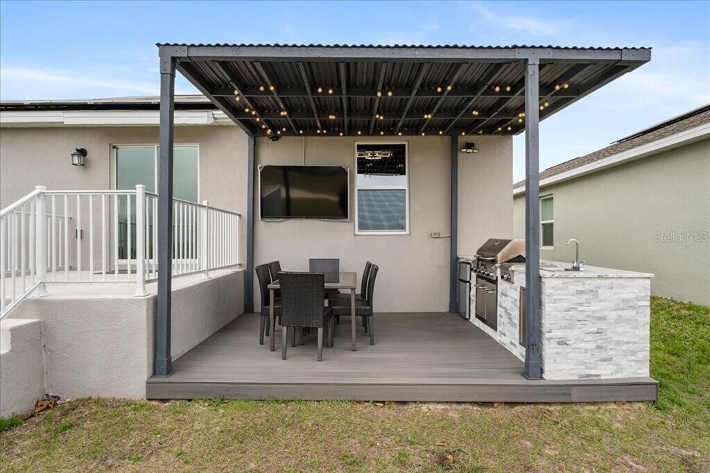 The home includes the TV located in the outdoor kitchen,along with everything you see in that area during your visit. The solar panels are leased. The current owner pays $70 monthly month for the lease,plus approximately $20–$40 monthly for electricity depending on usage,making it a very affordable energy cost for your lifestyle. MLS# O6394968