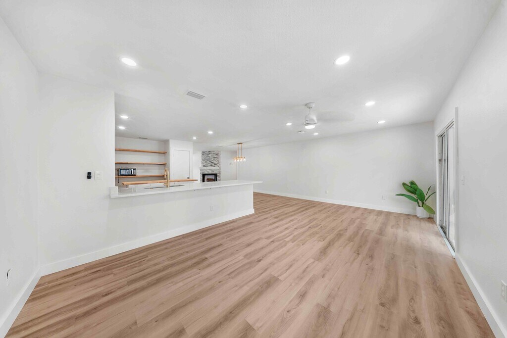 Welcome to this beautifully renovated 3-bedroom, 2-bathroom home that is perfectly positioned on an oversized corner lot in a quiet neighborhood. Step inside to find luxury vinyl flooring throughout, modern appliances, and a stylish kitchen featuring quartz countertops and a butcher block island--perfect for entertaining. The updated, natural stone fireplace adds warmth and charm to the spacious living area. Both bathrooms have been completely remodeled with spacious double vanities and contemporary finishes. Outside, enjoy your fully fenced private backyard complete with an in ground pool, relaxing hot tub, and outdoor kitchen area, ideal for Florida living and year-round gatherings. *Owner will consider a short lease term. *This home is for sale or rent.