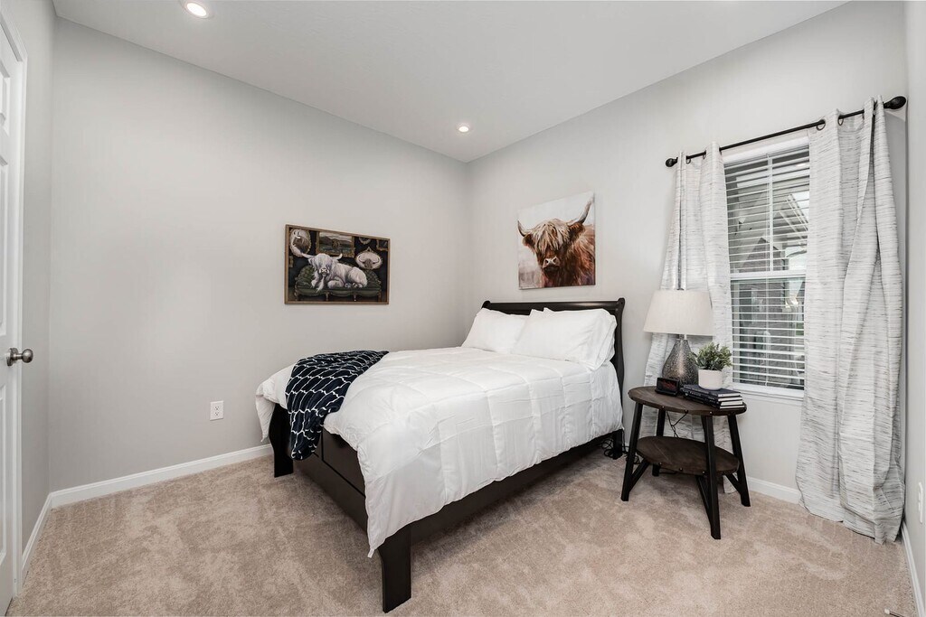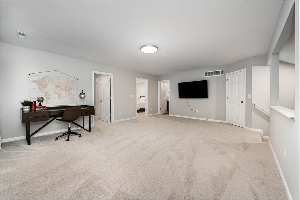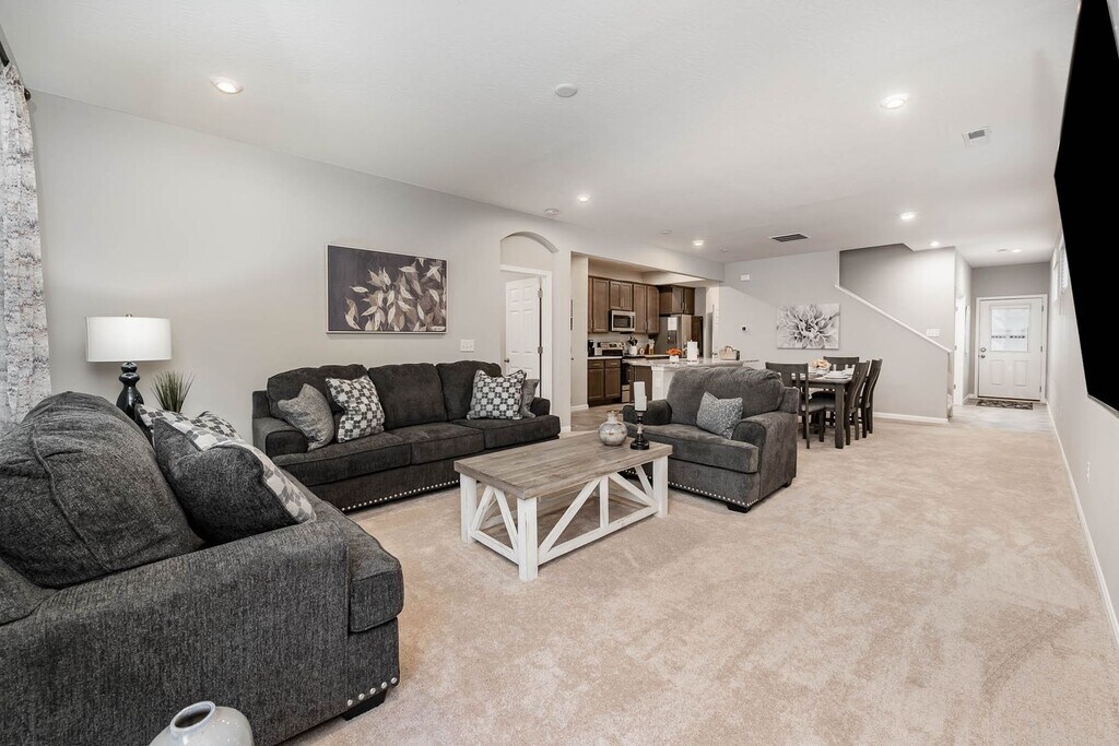 Fully Furnished. Fully Stocked. Includes all utilities and High-speed Internet. When you walk in the front door you will be greeted by a large living space, dining area, and kitchen (with your most needed appliances). Relax and unwind in front of the large smart TV, or cook up a tasty meal with your brand-new stainless steel appliances. The kitchen also has an LG refrigerator that features a "craft icemaker" for your old-fashioned or bourbon. Down the hall from the kitchen, you will find a large pantry, a half bathroom, and a laundry room with a full-size washer and dryer. If you peek in the closet you will find an iron, ironing board, detergent, dryer sheets, and extra cleaning supplies. There are two bedrooms on the main floor which require no steps! When you enter the home, the double bedroom with a small closet is directly to the left. The master suite with a king-size bed, smart TV, walk-in closet, and walk-in shower is located at the back of the home. Take the carpeted steps to the second floor and you will find a large flex space where you can work and play. During work hours, you will have access to a large desk and comfortable chair so you can get down to business. After the sun goes down, enjoy watching your favorite show or movie on the large flat-screen TV or enjoy a game of pool. There are two bedrooms located on the second floor along with a full bathroom with a shower/tub combination. The queen bedroom has a dresser and closet. The king bedroom has a smart TV and closet. HOA rules must be followed and HOA does require 6 month minimum stay While this home may be a duplex, we can assure you that the space is fully yours! As well, no noise should be coming through the walls. The entire home is exclusively yours without interruption during your stay, so relax, unwind, and make yourself at home. Other than the already mentioned amenities, the house also features: ? High-Speed Wi-Fi ? Central Air Conditioning ? Central Heating ? Washer/Dryer ? Iron/Board ? Free Parking ? Towels and Basic Consumable Toiletries ? ADDITIONAL ACCOMMODATION ? Traveling in a larger group, or your preferred dates are already taken? You'll be happy to know that we offer additional accommodation in the area. Please browse our host profile for the complete list of Homes. ? COVID-19 SANITIZATION ? The health, safety, and well-being of our guests are of utmost importance. For this reason, we use a thorough cleaning process after each check-out. ? NO SMOKING INSIDE ? Please refrain from smoking inside the home! Any smoking evidence will result in a fee for odor removal and furniture cleaning. ? NO PARTIES/EVENTS ? We kindly ask you to treat our home as your own to preserve its pristine condition for future guests and your return visits.