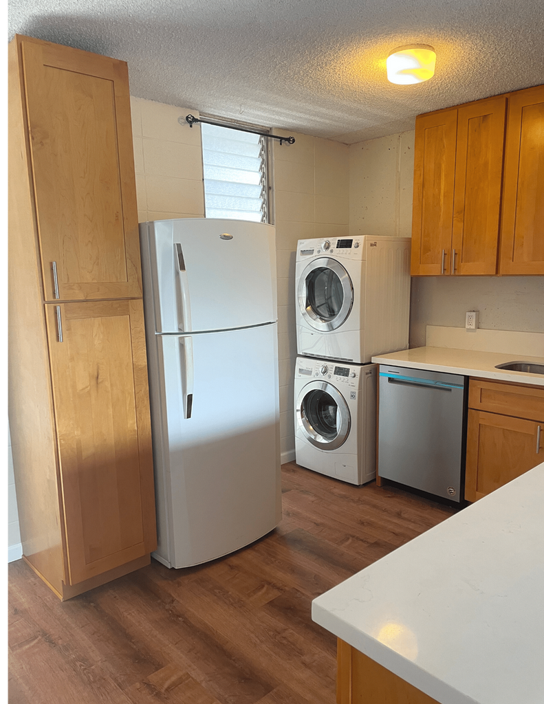 Welcome to Cathedral Point-Melemanu in Mililani! This breezy 1-bedroom, 1-bathroom 4th floor apartment features views of the lush green surroundings. The spacious lanai is the perfect place to enjoy your morning coffee or a peaceful pau hana. Water/Sewer is included in the monthly rent. Conveniences include an in-unit washer and dryer, walk-in closet, and 1 assigned uncovered parking space. The kitchen includes quartz countertops, wood cabinetry, and a dishwasher. Located close to Schofield Barracks, Wheeler Army Airfield, Mililani Town Center, restaurants, two parks, and the North Shore. There is no A/C, but you can bring your own portable unit (no window A/C allowed). Contact Carolyn Murren (R) License RS-85219, to schedule a viewing: . Lease term: 12 months. $22 application fee per applicant Income requirement: 2.5x the monthly rent Credit score requirement: minimum of 675 Renters Insurance is required. KAWAKAMI PROPERTY MANAGEMENT, INC. NOTE: Photos of the living room, lanai and bedroom are virtually staged. Furniture is not actual/included.