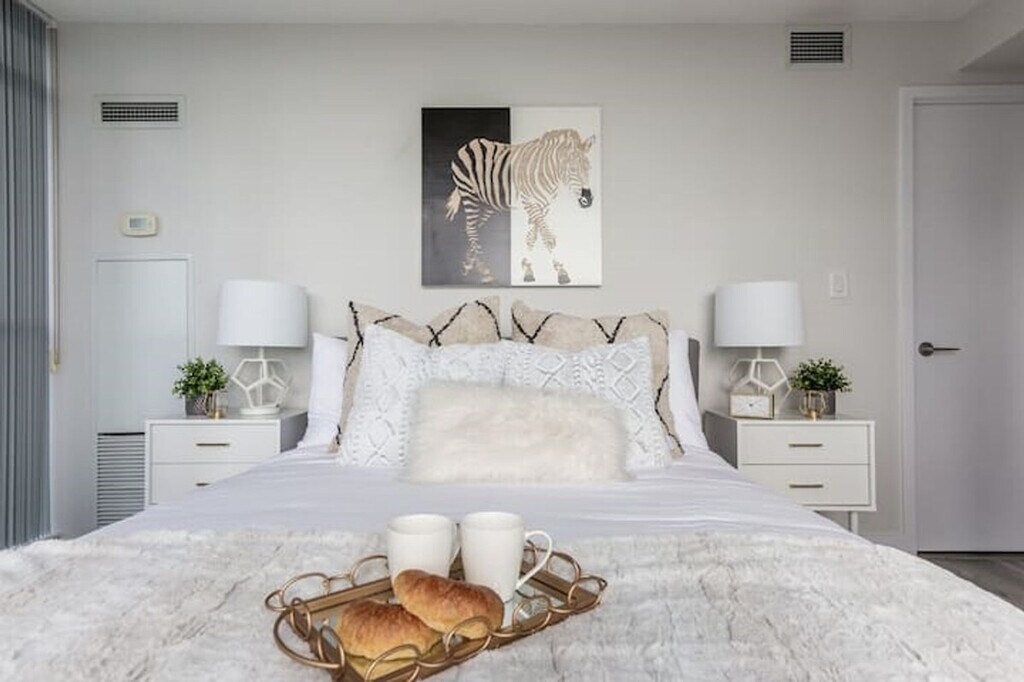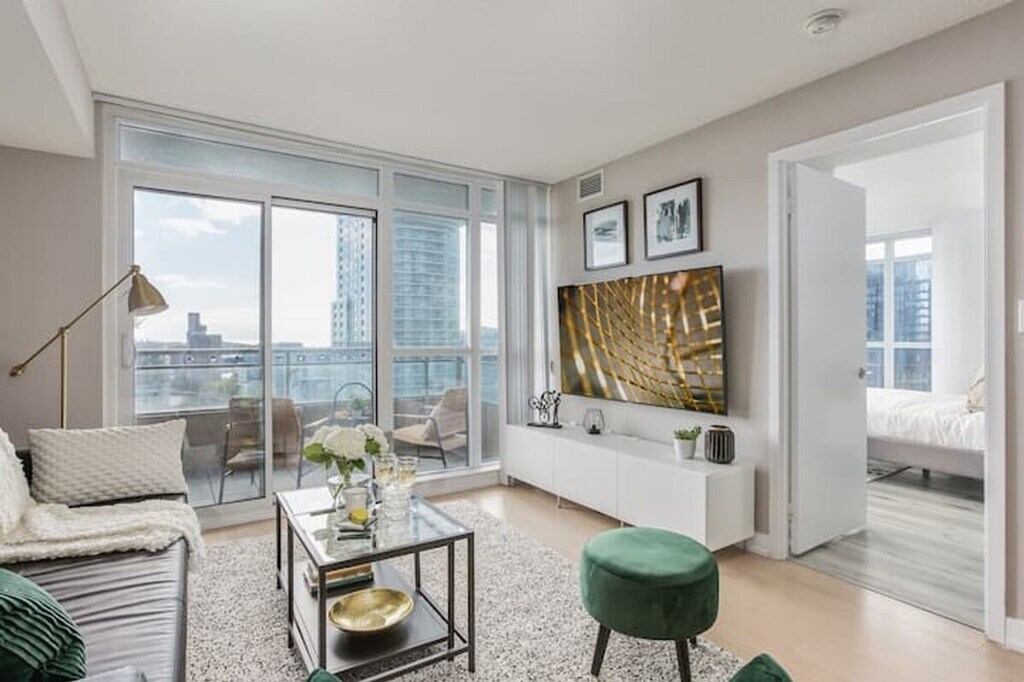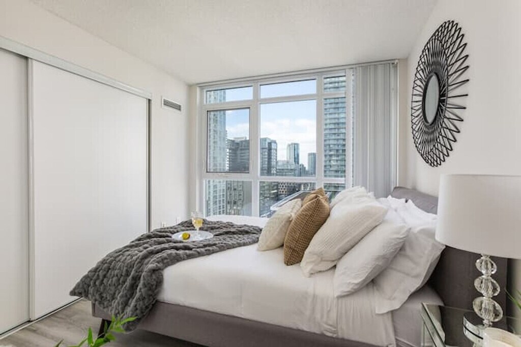 Feel right at home in this modern 2-bedroom apartment on the 12th floor, offering amazing lake views in the heart of the downtown entertainment district. This comfortable suite has everything you need. The fully functional kitchen is equipped with tea, coffee, a kettle, coffeemaker, and toaster. A washer and dryer are available with supplies. The 2 bathrooms include towels, shampoo, conditioner, body wash, a hair dryer, and other toiletries. Paid underground parking with in/out privileges is available upon request for $20 per night. A travel crib (for babies 0-18 months) and bed rails are available for $10 per item per night. Pets are allowed for a fee of $20 per pet per night. Enjoy easy access to the TTC, Union Station, Lake Shore, and Gardiner Expressway. This apartment is steps away from the CN Tower, Rogers Centre, Union Metro Station, Financial District, bars, restaurants, Sobeys Grocery Store, and Bishop Airport. According to the condo rules, information about guests must be provided to the condo management prior to arrival, including each guest's name and ID details, and vehicle and license plate numbers if parking is required. Guests whose names or IDs do not match the information given are not allowed into the building. Includes Registration Number: STR-2502-GKPPPT [SI]