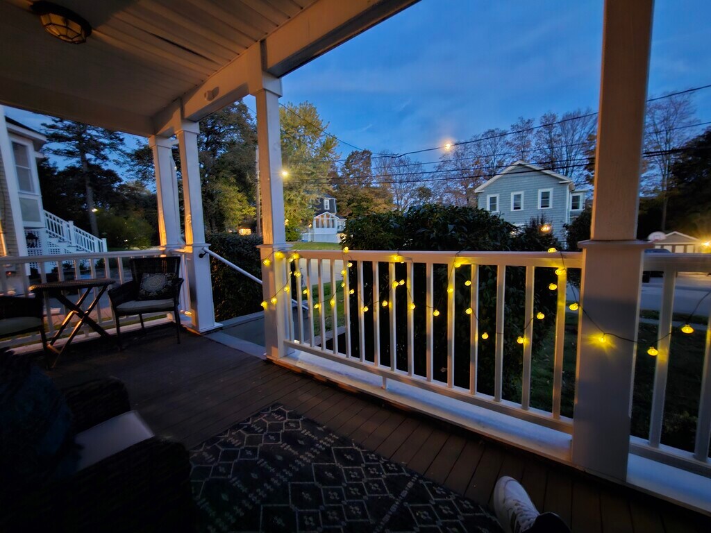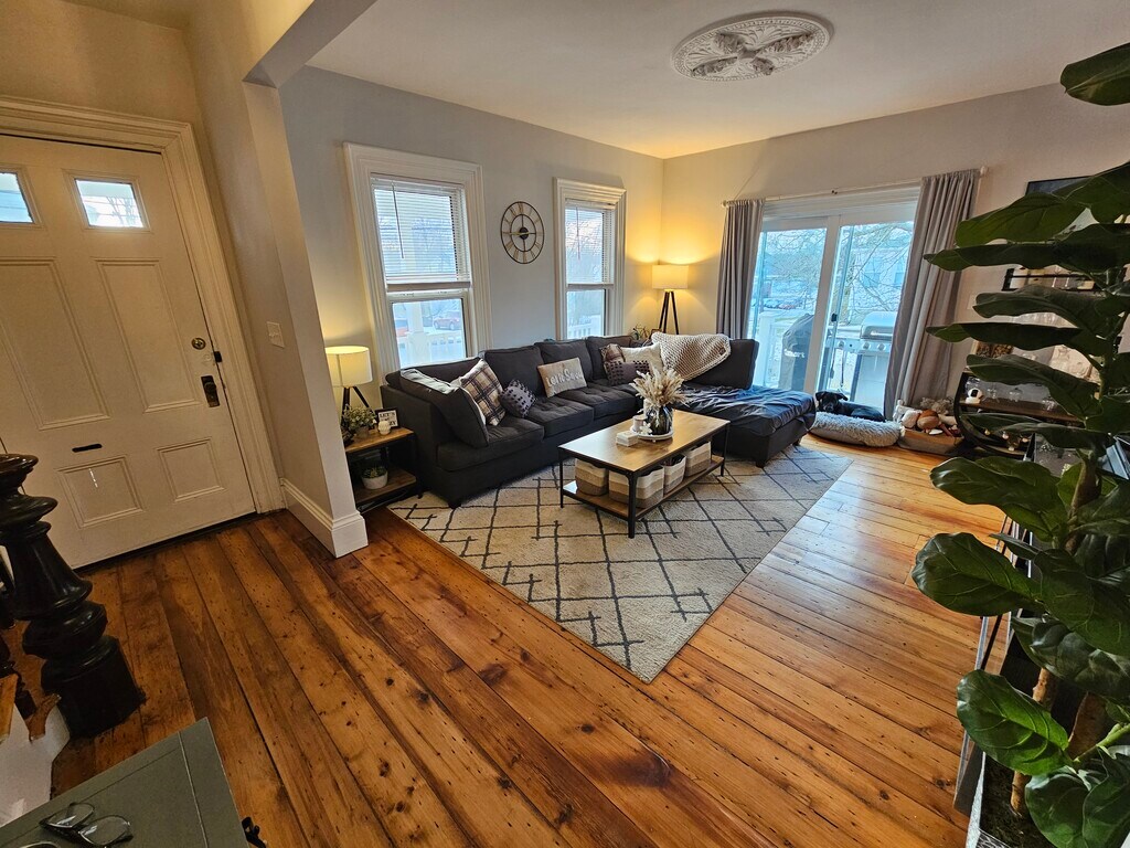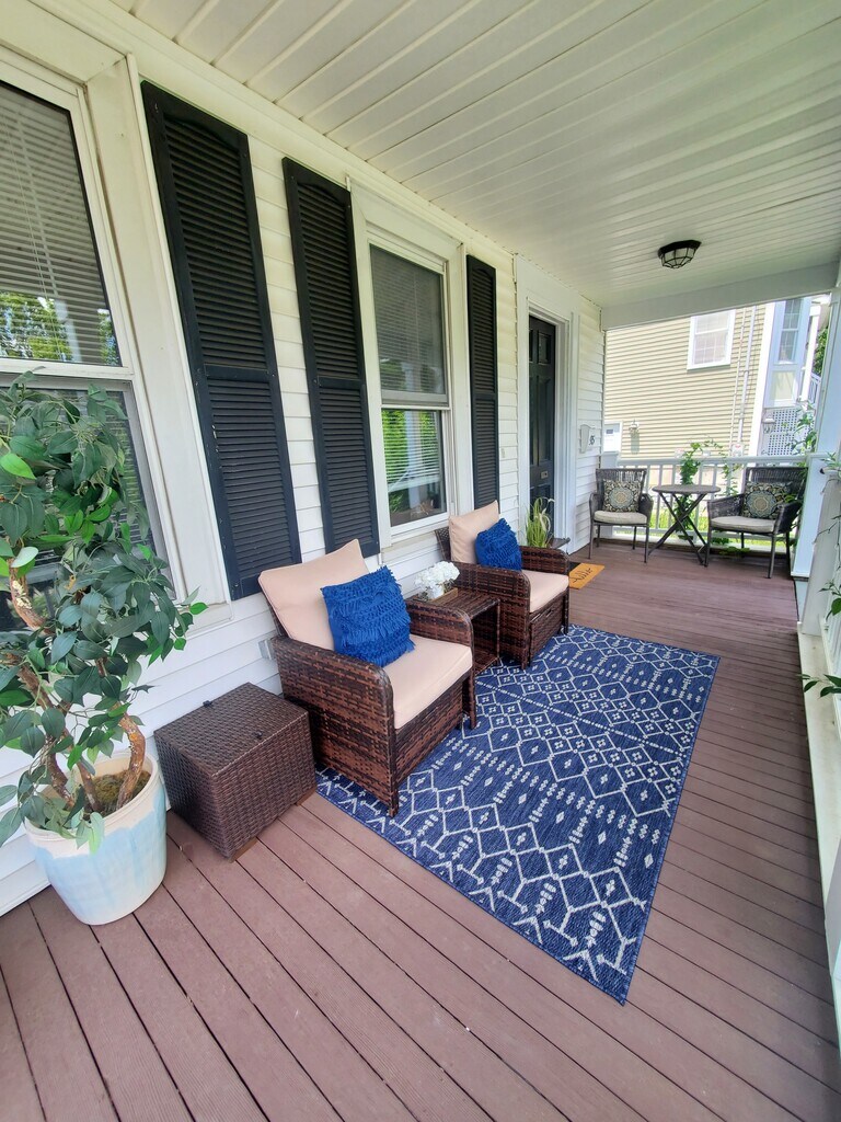 This lovely home was renovated 2019, allowing it to maintain its classic charm while supporting brand new features. This sunny home has beautiful original and wide pine floors throughout. The spacious living room contains a sliding door that opens up to a beautiful sunny deck, perfect for grilling or relaxing on a nice afternoon. The kitchen offers plenty of space with brand new appliances, countertops, custom cabinets, and a beautiful sunny breakfast nook. The mudroom features a custom-made bench with hooks and shelving and includes main level laundry. Upstairs features 2 big bedrooms and a newly finished full bathroom. The sunny, front facing master bedroom contains a large walk-in closet with built-in shelving. The large bathroom contains new fixtures, vanity, and tile. This unit has inside access to both a large basement as well as walk up attic for additional storage. Walking distance from Dedham Center for a convenient night out and weekly summer farmers markets, and a short 5-minute drive to Legacy Place.