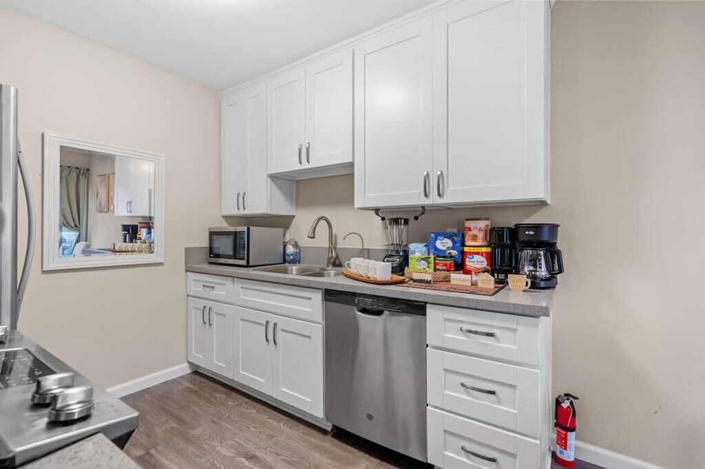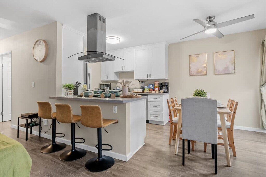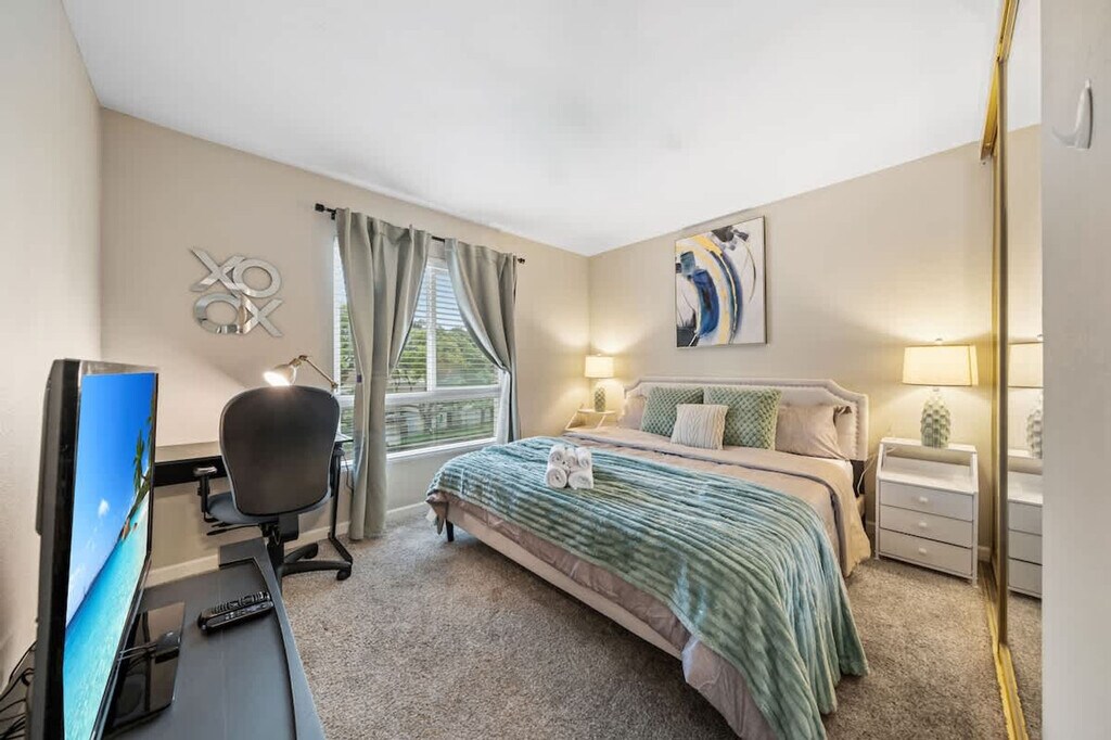 Welcome to this family home in San Diego, where you'll feel at home. This condo is centrally located in Mira Mesa, a family-friendly neighborhood. The kitchen is fully equipped with a gas stove/oven, blender, toaster, cooking pans, baking trays, coffee, oil, sugar, and salt, as well as modern appliances including a coffee machine, microwave, and fridge. The air-conditioned living room features a 65-inch flat-screen smart TV and comfortable couches. The bathroom is fully stocked with shampoo, body wash, a hairdryer, and fresh towels. An in-building washer, dryer, and detergent are available for your convenience. Enjoy free assigned parking for 2 cars. Pets are welcome. Early check-in or late check-out at 1 PM is available for a fee. This centrally located condo is close to major freeways, schools, parks, and shopping centers. Explore nearby attractions such as Mira Mesa Mall, Los Peñasquitos Canyon Preserve, and Miramar Reservoir. With its convenient location and comfortable accommodations, this condo provides an ideal base for your San Diego explorations. Quiet hours are between 9 PM and 8 AM. Please keep noise to a low level at all times, and after 9 PM, all activities must move indoors with windows and doors closed. Excessive noise may lead to neighbor complaints or visits from local authorities, and a $1,000 violation fee may apply. Only guests and pets counted on the reservation are allowed on the property, and each unauthorized guest or pet may incur a $100 per person/pet per day/night fee. No smoking is allowed inside the home. Tampering or disconnecting security cameras, noise monitors, or other security devices will result in a $1000 fine. Reliable 500 Mbps Wi-Fi makes hosting online meetings or sharing large files easy. [SI]