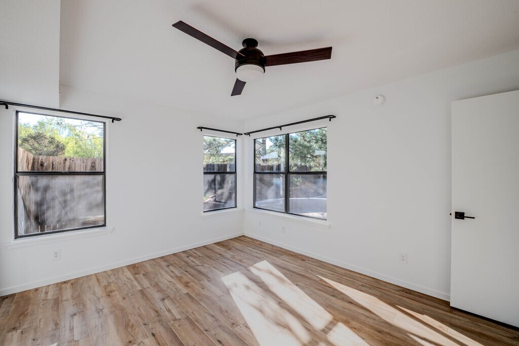Stunning and serene, two-bedroom, two-bathroom gem located in the desirable Pueblo Alegre subdivision in a cul-de-sac community. This inviting, single-story home features modern finishes, new vinyl luxury plank floors, and great bedroom separation. The spacious living room boasts high ceilings and Llumar-tinted windows, which cut down over 99% of UV rays and reduce heat transfer into the home by almost 50%—keeping the space cool and energy efficient while protecting interior furnishings. Enjoy high-output, energy-efficient, modern ‘low profile n-shaped’ A/C, designed to provide powerful cooling without blocking your window views. A washer and dryer are also installed and ready for use. Also includes forced air heat, lovely updated cabinets in the kitchen and baths, and a large picture window that fills the space with natural light. Outside, the large, landscaped backyard is beautifully enclosed for privacy. Exposed adobe brickwork in the front yard adds a unique, Southwestern touch to the home’s character. Two-car garage and ample driveway offer plenty of parking space. Tenant is responsible for any maintenance, repair, or associated costs of washer and dryer, for replacement of furnace filters, and for watering and maintaining the yard. HOA managed. Just across from Pueblo Alegre North Park and easy access to Frenchy’s Field Park, trails, shopping, dining, and entertainment. 12-month lease term is preferred. Utilities are not included. The deposit is equal to one month's rent. Pets are not allowed. Smoking of any kind is not allowed. No virtual tours. Property must be viewed in person prior to applying. Any application received prior to viewing the property will not be considered or processed. A $60 application fee and a minimum credit score of 620 is required. Please email Fiorina Properties to schedule a showing and include your phone number and email address. Brokerage: Fiorina Properties LLC Qualifying Broker: Riesha Fiorina