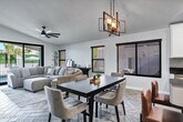 This beautifully furnished rental boasts 4 bedrooms with 3 bathrooms. Two in the house and one outside by the pool. There's two king size beds,1 queen and twin beds in the kids room. The backyard compliments this beautiful home with an entertainers paradise. Two large 70'' TV's located under the expansive pergola,an,outdoor kitchen with plenty of prep space,a large island for entertaining and outdoor dining,a putting green,a heated pool with a water feature,travertine through out and an outdoor fire/water feature for entertaining. There's plenty of outdoor seating for you and your guests. The outdoor bathroom with shower is the perfect compliment to this outdoor oasis. The solar panels help offset your energy costs. Long term lessee must transfer utilities.