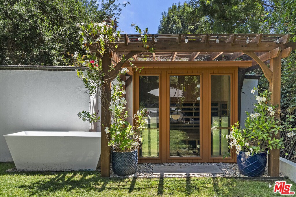 Tucked behind private gates at the end of a quiet drive, this reimagined Beverly Hills retreat embodies the essence of modern California living. Beyond the garden wall, the estate opens to a park-like sanctuary surrounded by mature trees, curated landscaping, and complete privacyan atmosphere that feels worlds away, yet just minutes from the heart of Beverly Hills.Recently and thoughtfully redesigned, the home embraces a bright, contemporary floor plan with effortless indooroutdoor connection through expansive French doors. Vaulted, beamed ceilings and skylights bathe the interiors in natural light, creating an elevated yet relaxed ambiance throughout.The spacious living room centers on a striking fireplace and wide-plank hardwood floors that flow seamlessly to the outdoor terraces. The residence offers three bedrooms and three baths, including a serene primary suite with a sitting area, fireplace, dry sauna, and an oversized walk-in closet. The spa-inspired bath features a soaking tub, steam shower, and dressing area rivaling a luxury resort.At the heart of the home, the chef's kitchen is outfitted with stone countertops and professional-grade appliances, opening to a sunlit dining area perfect for everyday living and entertaining.Altogether, this private, design-forward estate captures the romance of indoor/outdoor California living refined, tranquil, and moments from the best of Beverly Hills. MLS# 25610035