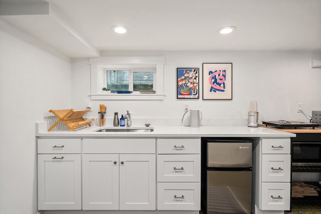 The advertised rate of $11,156/month is the lowest available price, based on a 30 day(s) stay with a move-in date of January 8, 2027. Rates vary depending on the duration of stay, season, and other parameters. For exact pricing and additional pricing components, please visit our website and enter your desired move-in and move-out dates. The rate is applicable when billed upfront; it can be higher if billed in multiple payments. Feel at home in this modern 1-bedroom basement suite in Seattle’s vibrant Ballard neighborhood. This 550 sq ft private-entry retreat is accessed via a short flight of stairs. This thoughtfully designed apartment features a bright open living area with plush seating and a Smart TV, a fully equipped kitchen with essential cookware, a dining table with seating for two, a comfortable queen bedroom with closet storage, a full bathroom with a tub and shower combo, an in-unit washer and dryer, and central heating for year-round comfort. A pack 'n Play and highchair are available upon request for $75 CAD each. Located in northwest Seattle near Ballard, this apartment sits in a quiet residential pocket known for its walkability, local cafés, breweries, and boutique shops. Ballard blends historic charm with a modern food scene, waterfront parks, and a relaxed Pacific Northwest vibe. You’re minutes from neighborhood dining, grocery stores, and convenient access to Fremont, Green Lake, and downtown Seattle. The apartment offers easy access to public transit with nearby bus routes connecting to downtown Seattle and surrounding neighborhoods. Major roads like Highway 99 and I-5 are just a short drive away, making commuting simple. The area is bike-friendly, rideshare services are readily available, and free street parking can be found close to the property. Main attractions include Ballard Avenue Historic District (~7 min drive), Golden Gardens Park (~12 min drive), Green Lake Park & Ride (~12 min drive), University of Washington (~15 min drive), Downtown Seattle (~20 min drive), and Space Needle (~15 min drive). The upper-level home is occupied; the basement unit is completely private and has its own separate entrance, ensuring guests have their own dedicated space. No parties, events, or large gatherings are allowed. Smoking is prohibited in the property and its vicinity. Pets are not allowed. Includes a dedicated workspace ideal for remote work or study and a stable internet connection. [SI]