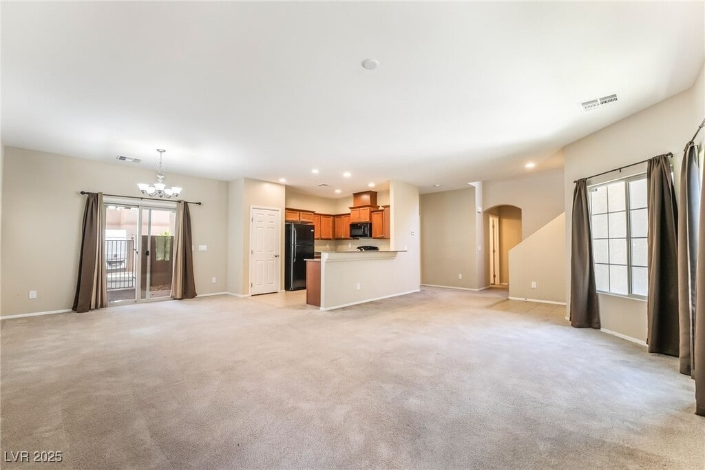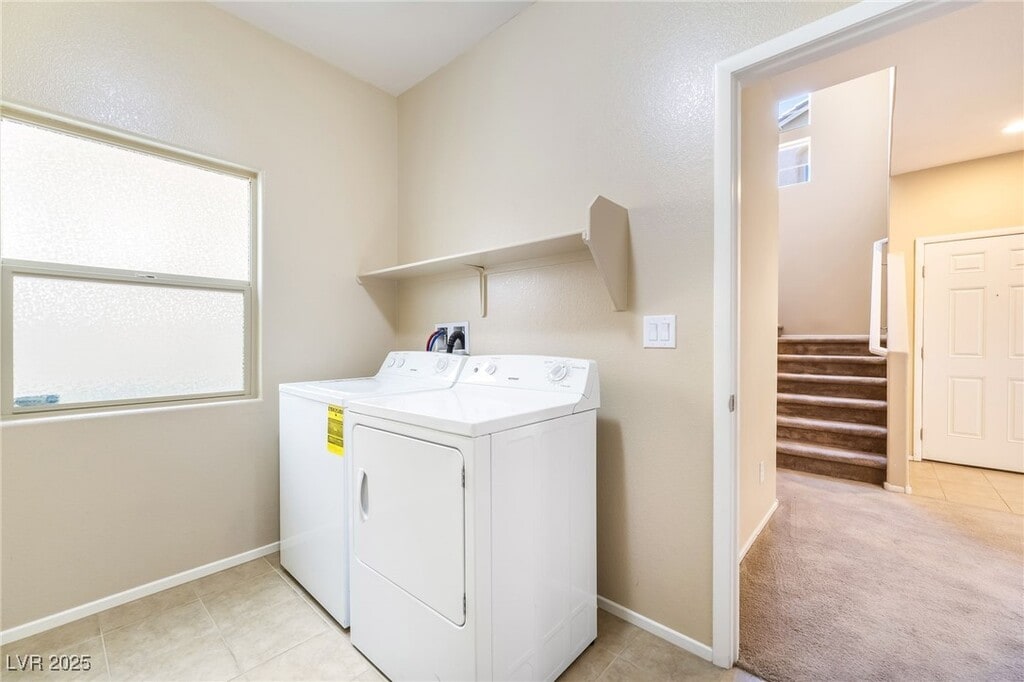 Welcome to this inviting two-story home featuring updated flooring downstairs, high ceilings, and plenty of natural light throughout. The kitchen offers ample cabinet space, essential appliances, and a convenient breakfast bar perfect for casual dining. The spacious primary bedroom is impressively large, complete with a walk-in closet, ceiling fan, and an ensuite bath with dual sinks. Additional bedrooms are well-sized, providing comfort and versatility. The backyard showcases low-maintenance desert landscaping, offering a peaceful outdoor space to enjoy the Las Vegas sunshine.