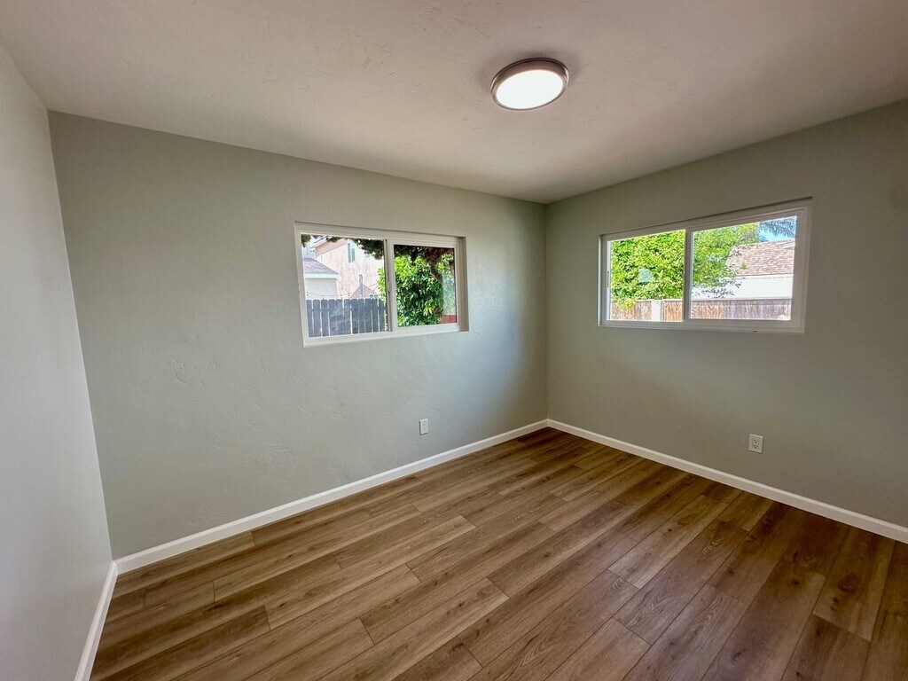2 bedroom 1 bathroom 800sqft home with fenced front patio and back yards plus connecting side run. Brand-new flooring and fresh paint throughout home plus newly installed double-paned windows. Remodeled kitchen with brand-new appliances including refrigerator, oven/range, and microwave. One-car garage with laundry hookups (gas & electric) plus plenty of driveway parking. Four storage closets/cabinets in house plus large closets in both bedrooms. Mini-split AC and wall heater in living room, ceiling fan in dining area. Pets negotiable with owner approval. Owner pays for sewer. 3 1/2 miles from Silver Strand Training Complex. 8 1/2 miles to Naval Amphibious Base Coronado, 10 miles from Naval Air Station North Island. Contact us for a showing, we do not accept applications until after you have viewed the property in person. DO NOT bother tenant in front house.