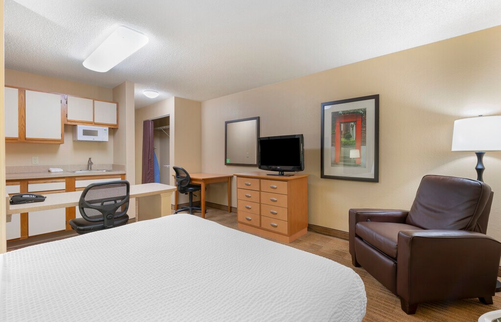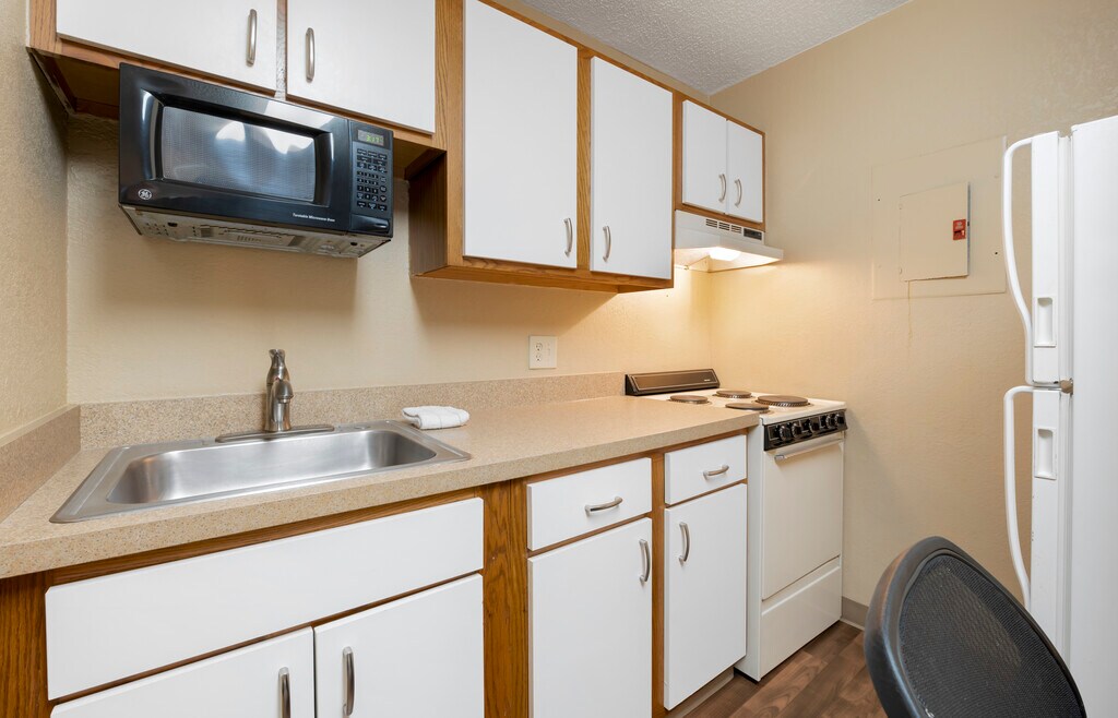 Enjoy a fully furnished studio suite in our hotel at an affordable rate with free wi-fi, free utilities and free premium cable. Each studio suite has a full kitchen with full-size refrigerator, stovetop and microwave, and has a flexible workspace and plenty of storage. All our hotels are pet-friendly and have on-site guest laundry available. Plus, there are no long-term commitments and you can adjust your length of stay to meet your individual needs, subject to applicable property and/or local restrictions. Additional fees may apply. Booking restrictions and taxes apply. Rates and availability are subject to change without notice.