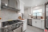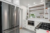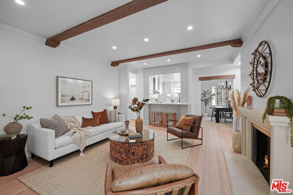 Discover the allure of classic 1930s Old Hollywood charm seamlessly blended with modern conveniences in this rare two-story townhome located in the heart of Beverly Hills. With two bedrooms and one and a half bathrooms, this meticulously renovated residence offers just under 1,400 sq ft of elegant living space. The main floor welcomes you with a living room featuring newly renovated hardwood floors, a cozy fireplace with a classic mantle, and abundant natural light, highlighted by exposed wood beam ceilings. The elegant dining room showcases a beautifully crafted ceiling with rich wood planks, creating a warm, inviting atmosphere that perfectly complements the sophisticated decor. The modern kitchen is a chef's dream, featuring brand new stainless steel Caf appliances, including a French-door refrigerator with an internal water dispenser and a freezer drawer, a built-in microwave drawer oven, a stainless steel dishwasher, and a smart gas commercial-style range with six burners. The kitchen also offers a breakfast bar and a separate laundry area with a frontload LG washer and dryer. A convenient powder room is available for guests downstairs. Upstairs, you'll find two spacious bedrooms and a beautifully appointed bathroom. The primary bedroom features French doors leading to a private deck, perfect for relaxing or entertaining. The bathroom is elegantly designed with exquisite tile floors, quartz countertops, and a separate tub and shower. Additional features include recessed lighting, central air and heat with Google Nest smart thermostats on each floor, and one private garage with remote control access. Ample storage areas and linen closets are thoughtfully placed throughout the home. Enjoy the shared private brick patio for dining al fresco. Located just moments away from iconic landmarks such as Rodeo Drive, Beverly Gardens Park, Saks Fifth Avenue, and the historic Beverly Hills Hotel, this townhome offers a rare opportunity to live in one of the most coveted areas of Beverly Hills. Experience the perfect blend of historic charm and modern luxury in this exceptional residence. MLS# 26634117