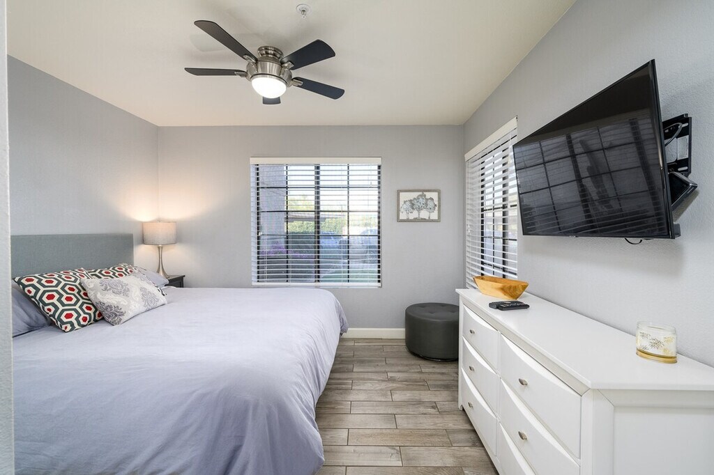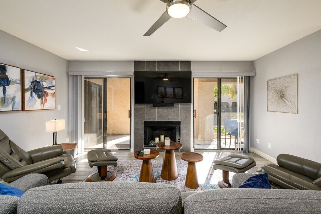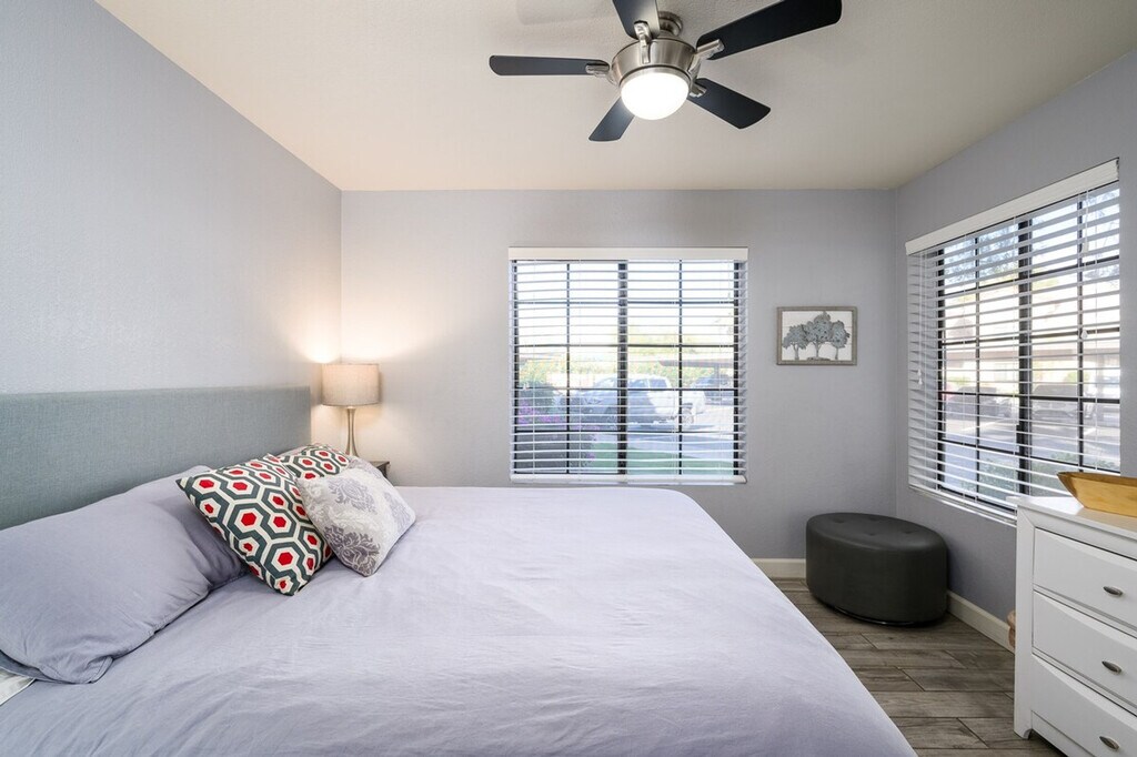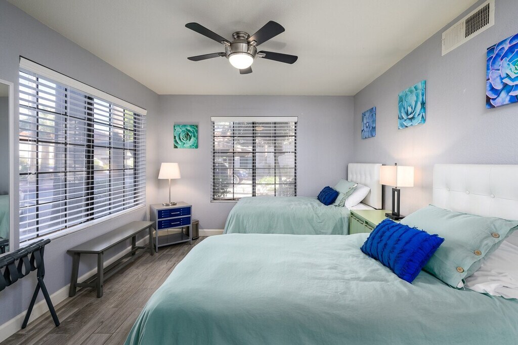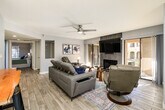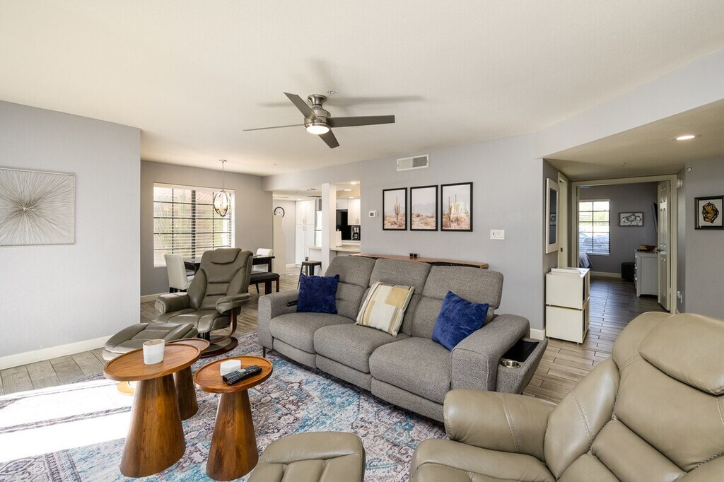 Welcome to Villa Capri, a rare 3-bedroom, 2-bathroom condo located on the 1st level, just steps away from the pool and spa. This beautifully furnished home features two king-size beds and two twin beds, offering a comfortable stay for all guests. This condo is thoughtfully designed with no stairs and includes flat-screen TVs in every room. Enjoy the Arizona weather on the patio with three sliding doors. The property is centrally located close to Loop 101, Scottsdale/Shea Hospital, MAYO Hospital, and Scottsdale Greenbelt, which offers walking and biking trails. Nearby, you'll find restaurants, golf courses, and hiking opportunities. The condo is equipped with HD digital cable, local telephone, wireless Internet, and is fully furnished. You'll have easy access to the pool, hot tub, and multiple other pools, as well as tennis and pickleball courts within the complex. All linens, bath, and pool towels are provided, and free Wi-Fi is available throughout the condo. Villa Capri is centrally located, providing easy access to Loop 101 and nearby hospitals like Scottsdale/Shea and MAYO. The Scottsdale Greenbelt is nearby, offering walking and biking trails. You'll also find a variety of restaurants, golf courses, and hiking spots in the vicinity, making it a perfect location for both relaxation and adventure. There is a strict no-pet policy in place. Guests are liable for any damages caused to the property. [SI]