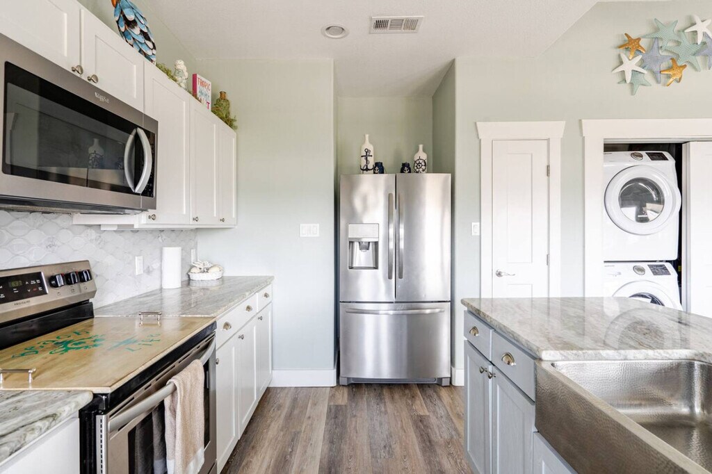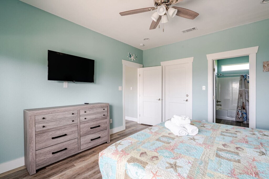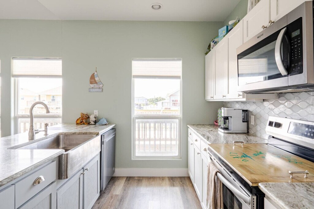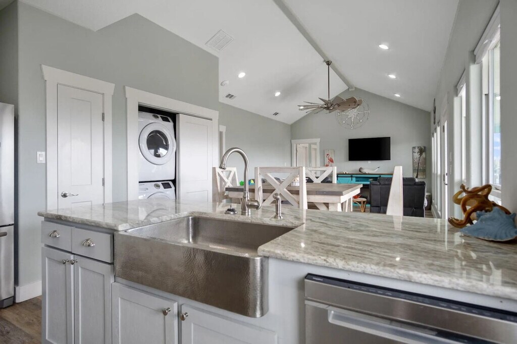 This charming 3-bedroom, 2-bathroom house is ideal for families and groups looking for a relaxing escape. Located just a short drive from the beach, this home offers everything you need for an enjoyable and memorable stay. The house features spacious bedrooms, including a kid-friendly bunk room, a full kitchen, and a luggage lift. Its convenient location is close to shops, the local grocery store, and especially the beach. Upon entry, you'll find an open-concept living room and kitchen, which also includes a washer and dryer. Off the living room, there is a bathroom and two bedrooms, one of which features two sets of bunk beds. At the back of the living room, there is a master suite with its own bathroom. You're free to use the whole house, the bottom patio, and the backyard. The house is conveniently located just a short drive from the beach and close to shops and the local grocery store, making it easy to enjoy the surrounding area. The luggage lift is not available as an elevator and is meant for groceries and luggage only. Maximum occupancy is 8 people, and any additional guests must be pre-approved. Only registered guests are allowed at the house, and any visitors must be disclosed and approved. There is a strict no-smoking policy, and no parties or events are allowed. Guests should maintain cleanliness throughout their stay and report any accidental damage immediately. Noise should be kept to a minimum during nighttime hours. Grilling is only allowed downstairs on the patio area, and the grill must be cleaned after use. Please rinse sand under the house after visiting the beach and leave sandy shoes on the deck by the front door. Do not flush feminine hygiene products or pour grease down the drains to avoid damaging the septic system. If guests are asked to leave due to irresponsible behavior, no refund will be given for lost days. Swimming at Crystal Beach is at the visitor's own risk as there are no lifeguards on duty. Please respect the home as you would your own. [SI]